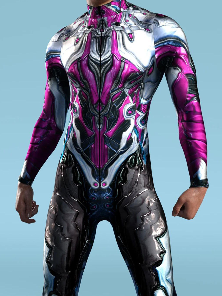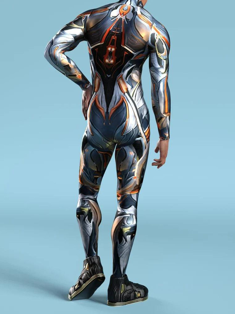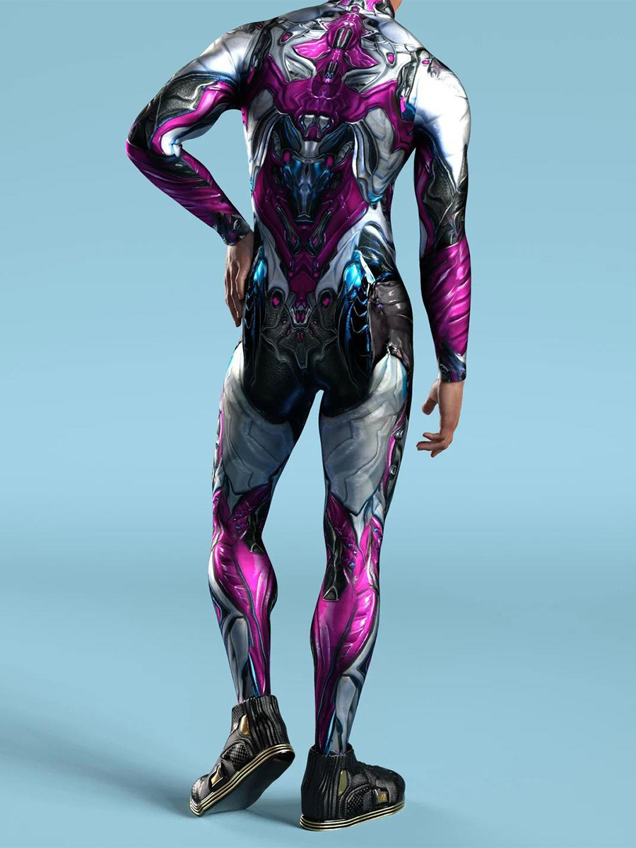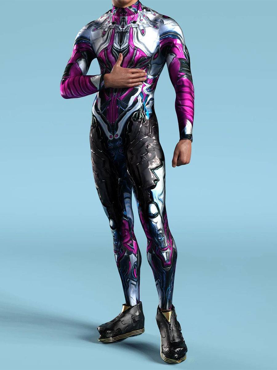 This future tech cyberpunk bodysuit features dynamic 3D-printed armor plating and geometric patterns, creating a sleek full-body suit with a cutting-edge tactical aesthetic.