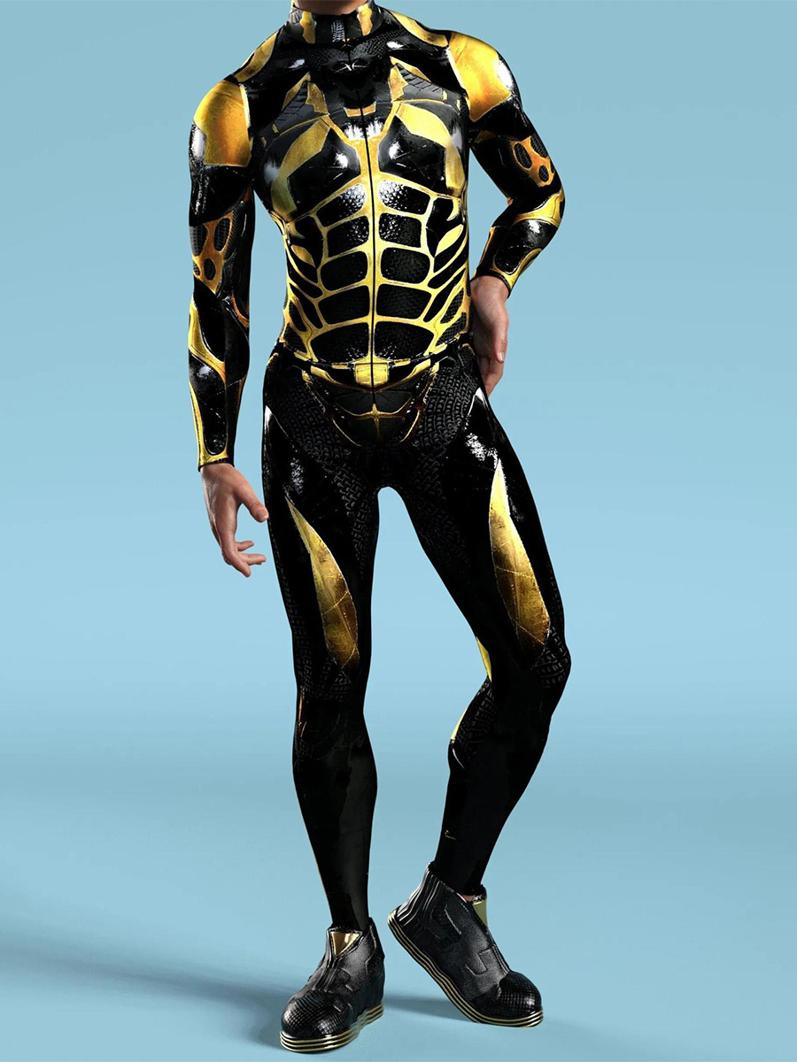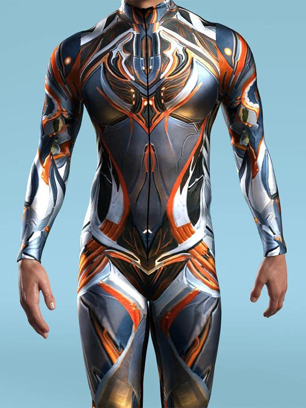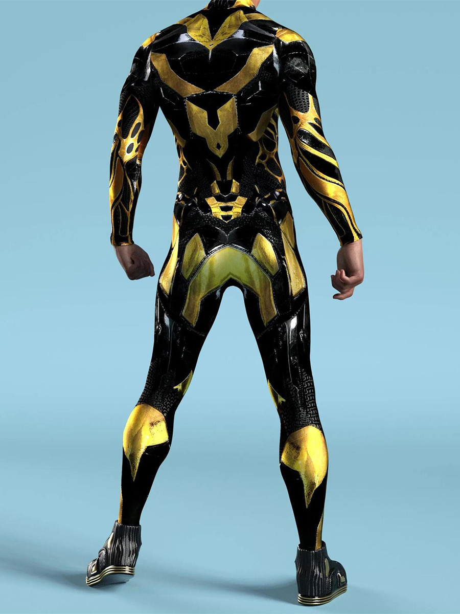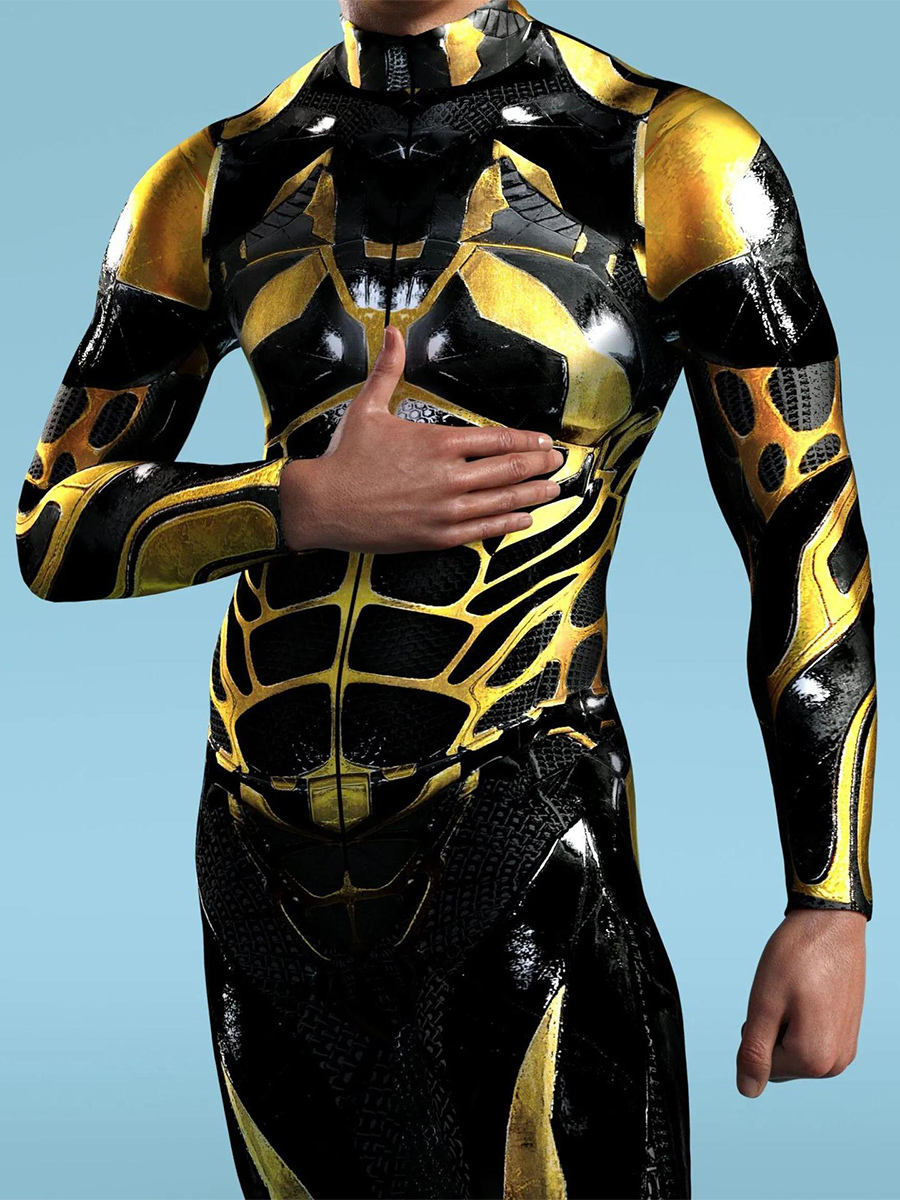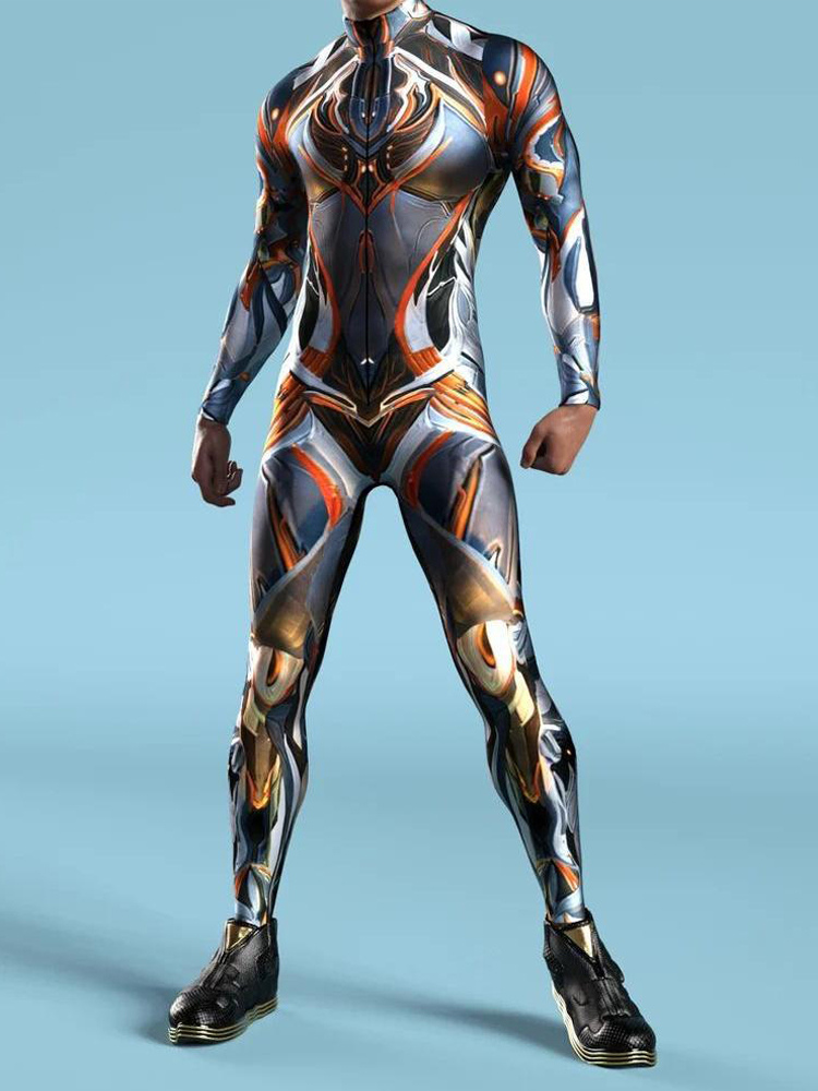 This future tech cyberpunk bodysuit features dynamic 3D-printed armor plating and geometric patterns, creating a sleek full-body suit with a cutting-edge tactical aesthetic.