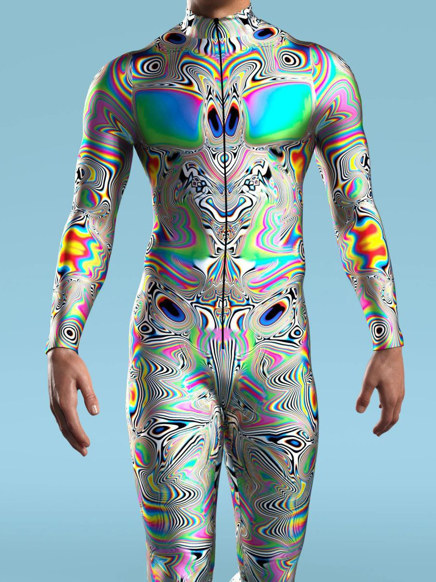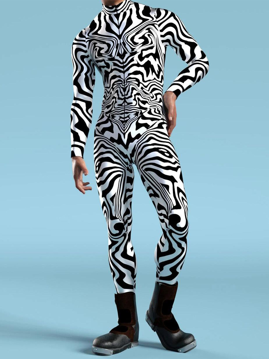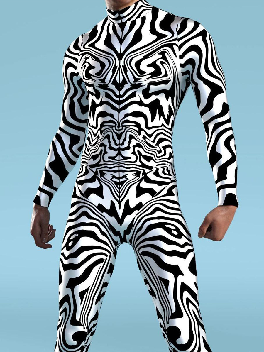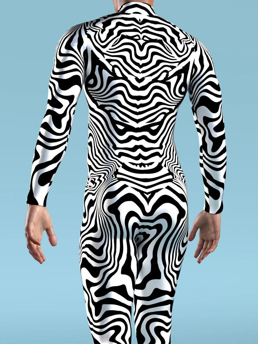 This zebra camouflage print bodysuit features a dynamic 3D optical illusion pattern, creating a form-fitting jumpsuit with striking visual depth and animalistic allure.