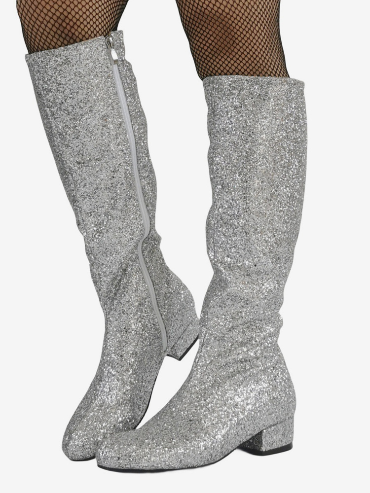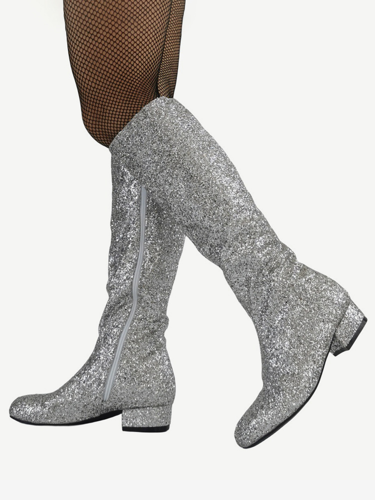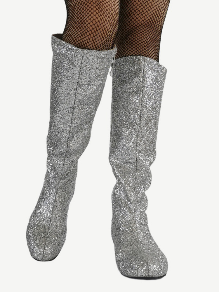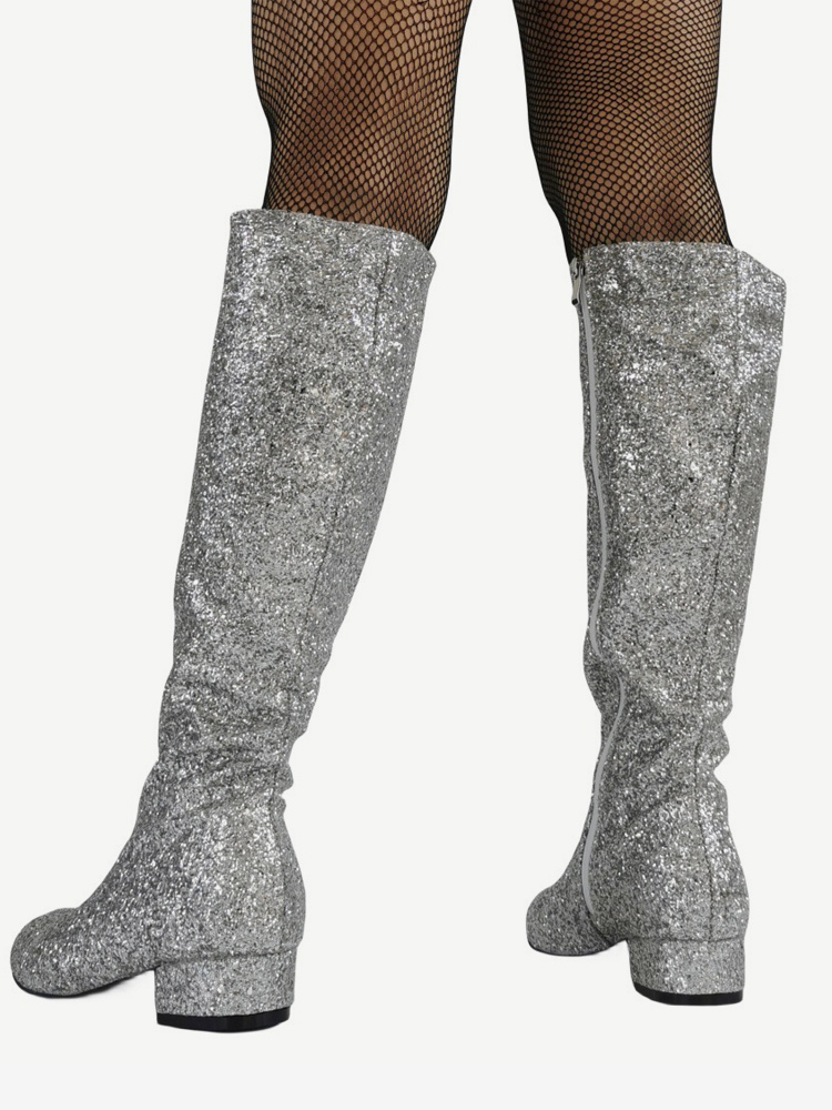 Crafted from shimmering gold metallic material with glitter accents, these men's knee-high boots feature a bold high heel and a striking silhouette, designed to captivate on stage or in avant-garde fashion settings.