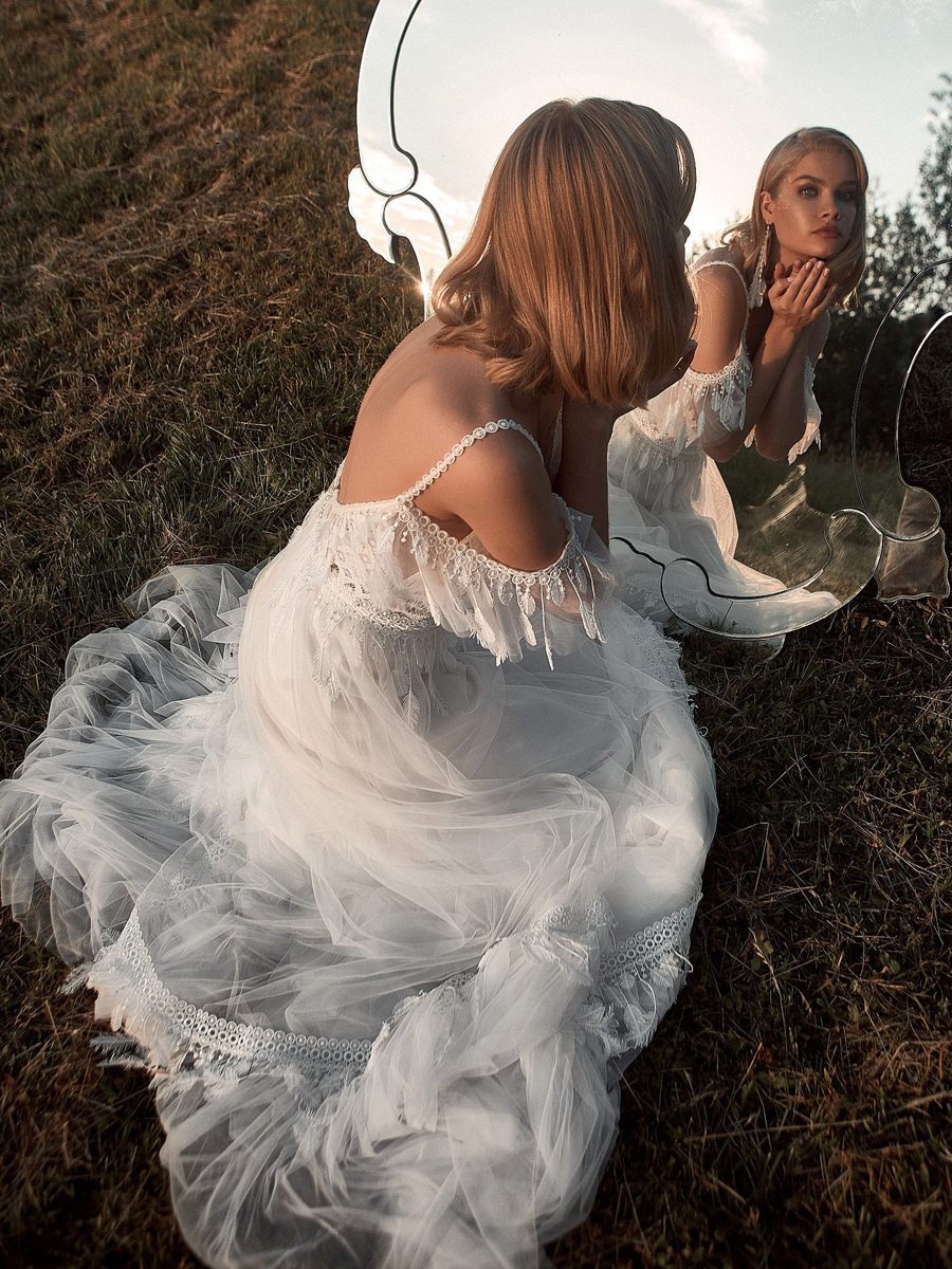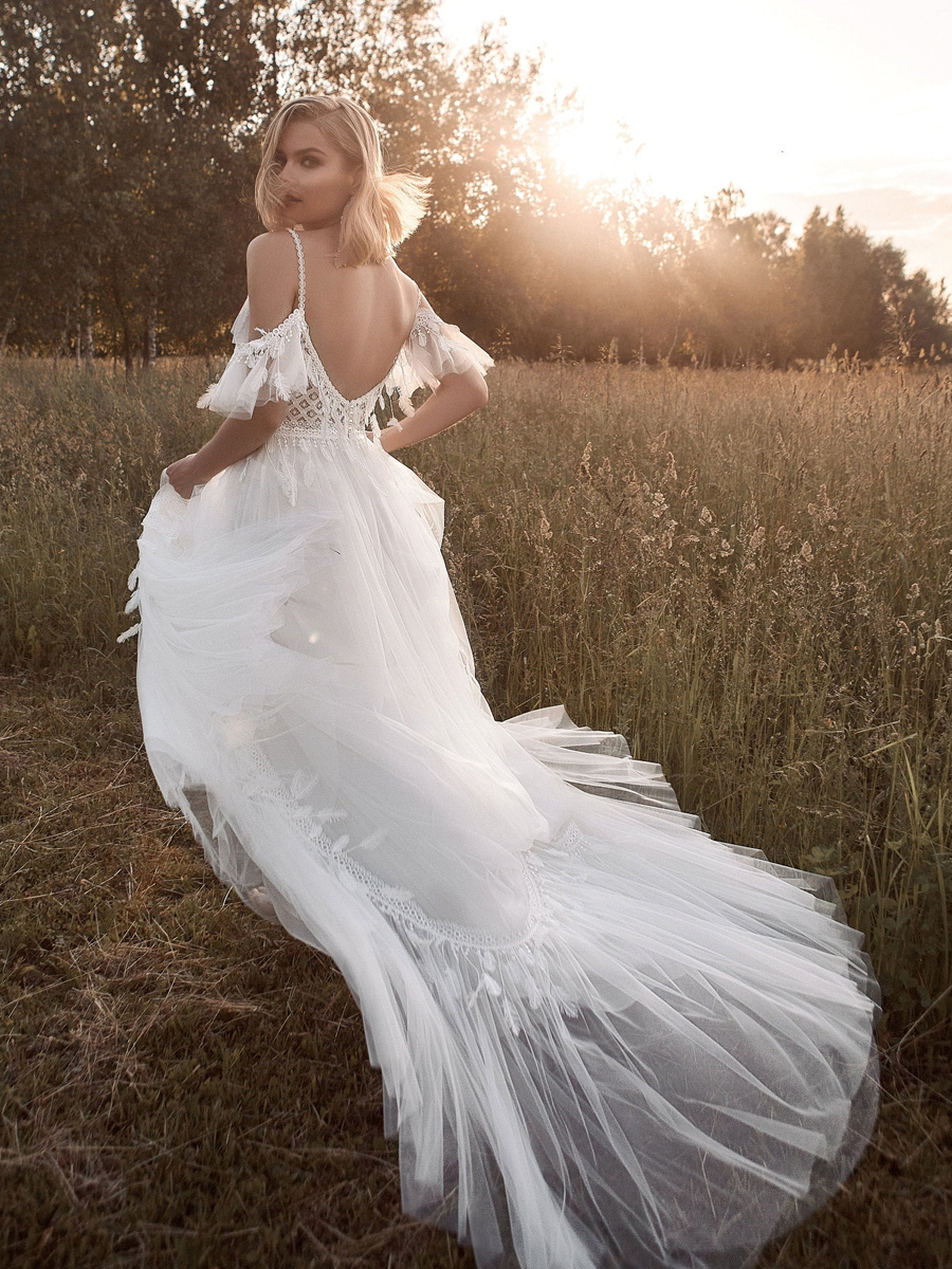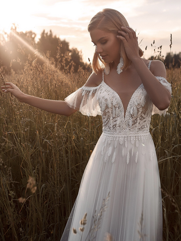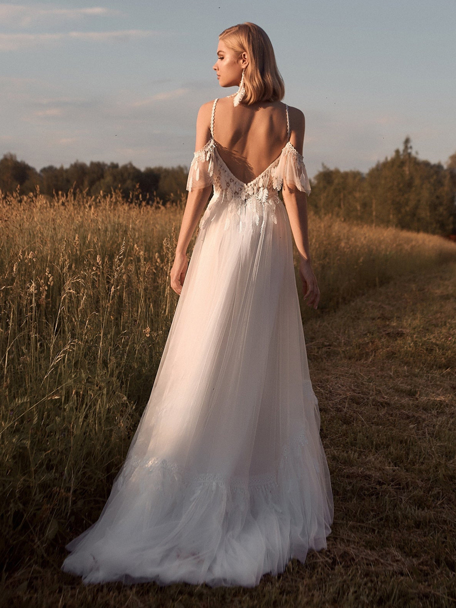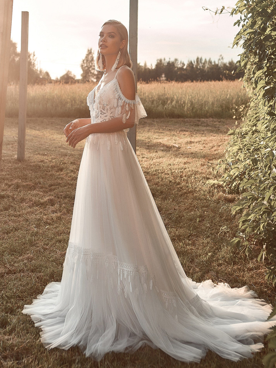ボヘミアンウェディングドレス レース フェザー Aライン トレーン付き ナチュラルウエスト ジッパー 半袖 Vネック アイボリー