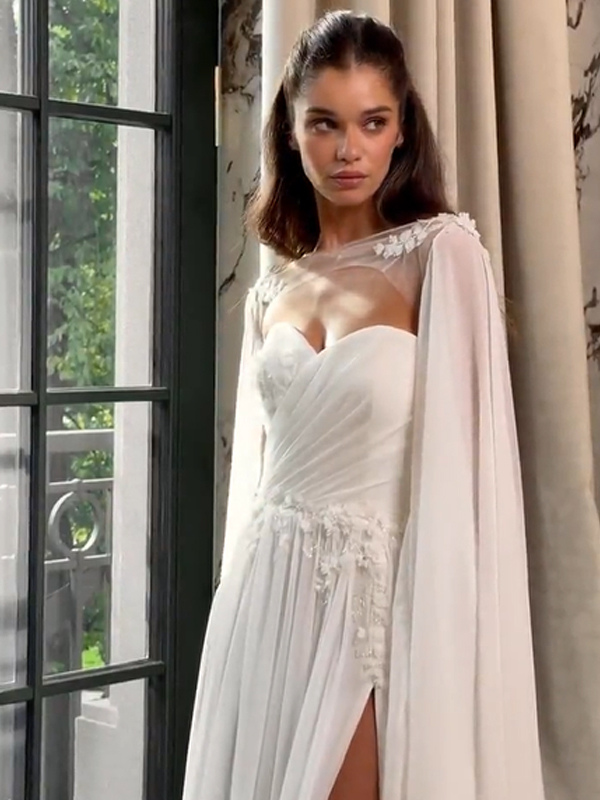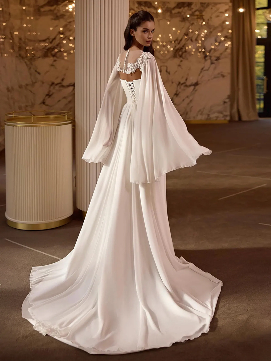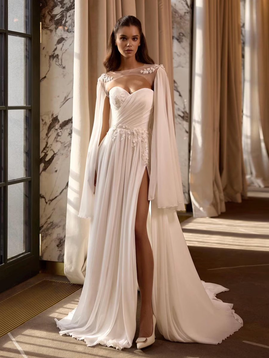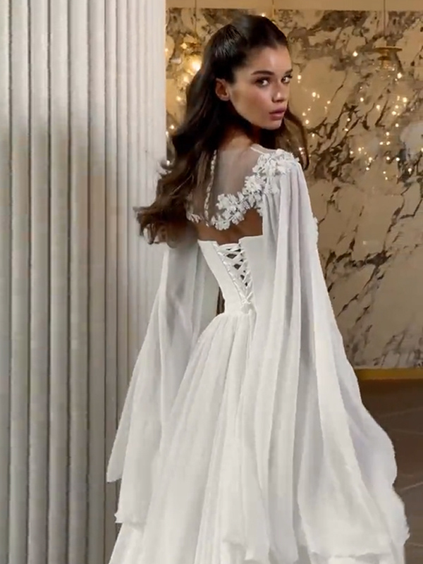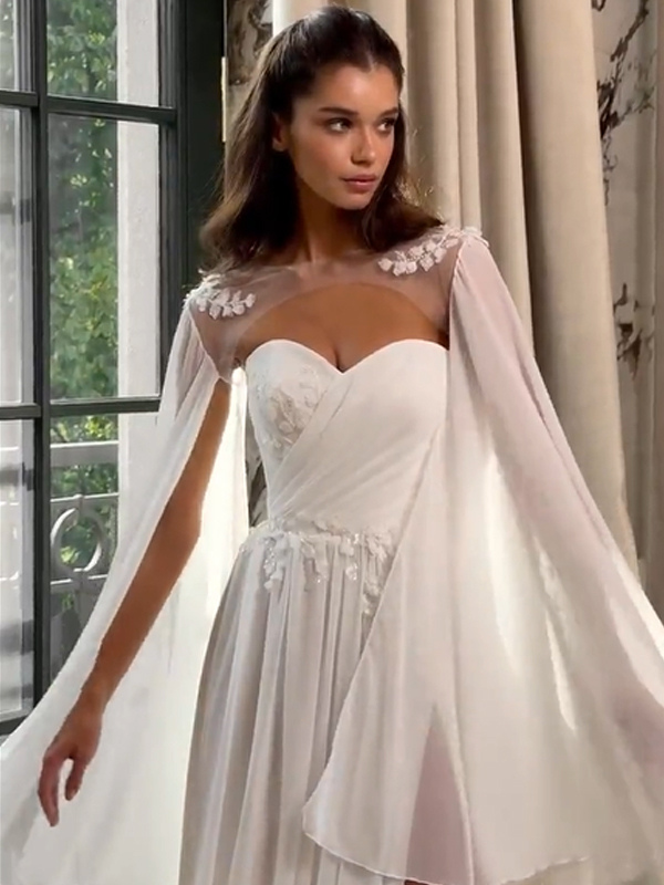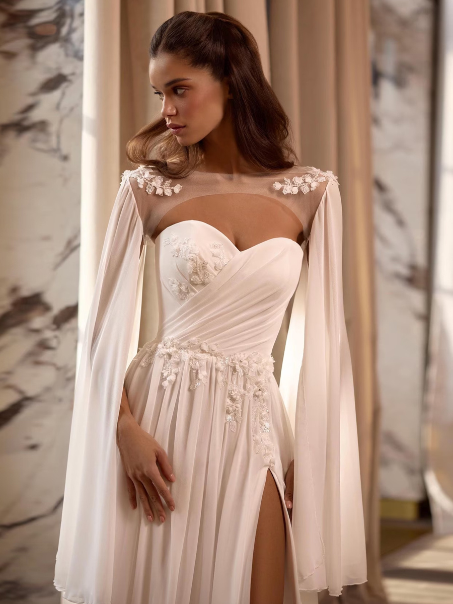 ウェディングラップ アイボリー ロングスリーブ イリュージョンネックライン スリットスリーブ ショール シフォン レース ブライダルカバーアップ