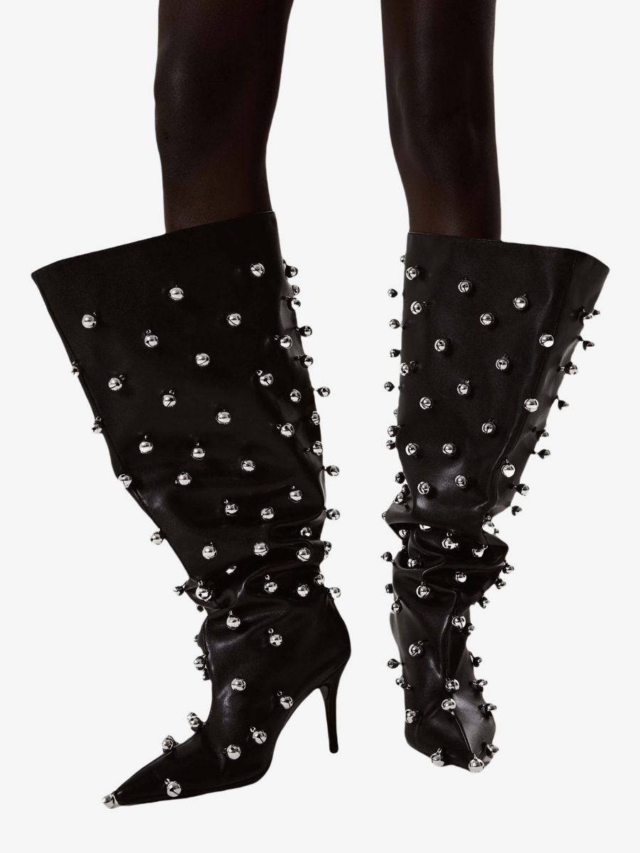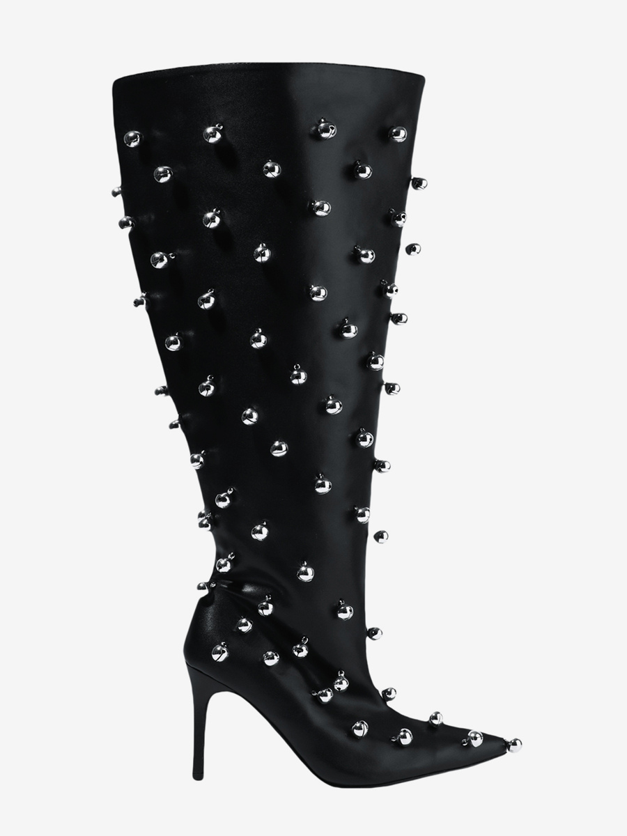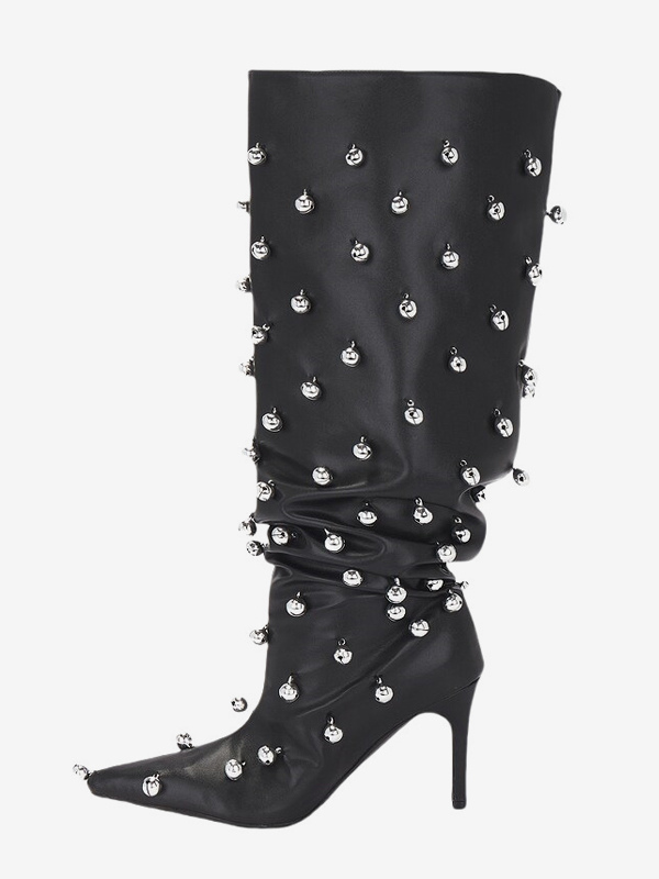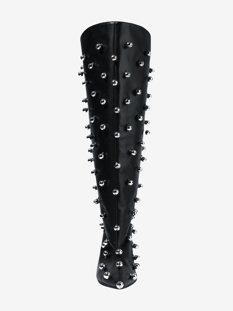 ブラックニーハイブーツ、Wo Memen's ポインテッドトゥビーズハイヒールワイドカーフブーツ