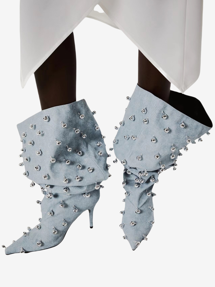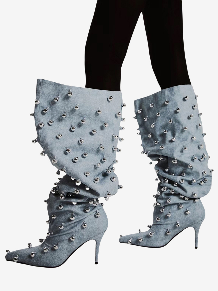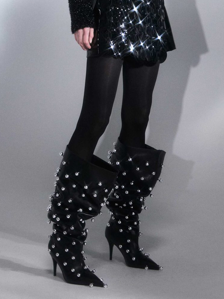 ブラックニーハイブーツ、Wo Memen's ポインテッドトゥビーズハイヒールワイドカーフブーツ