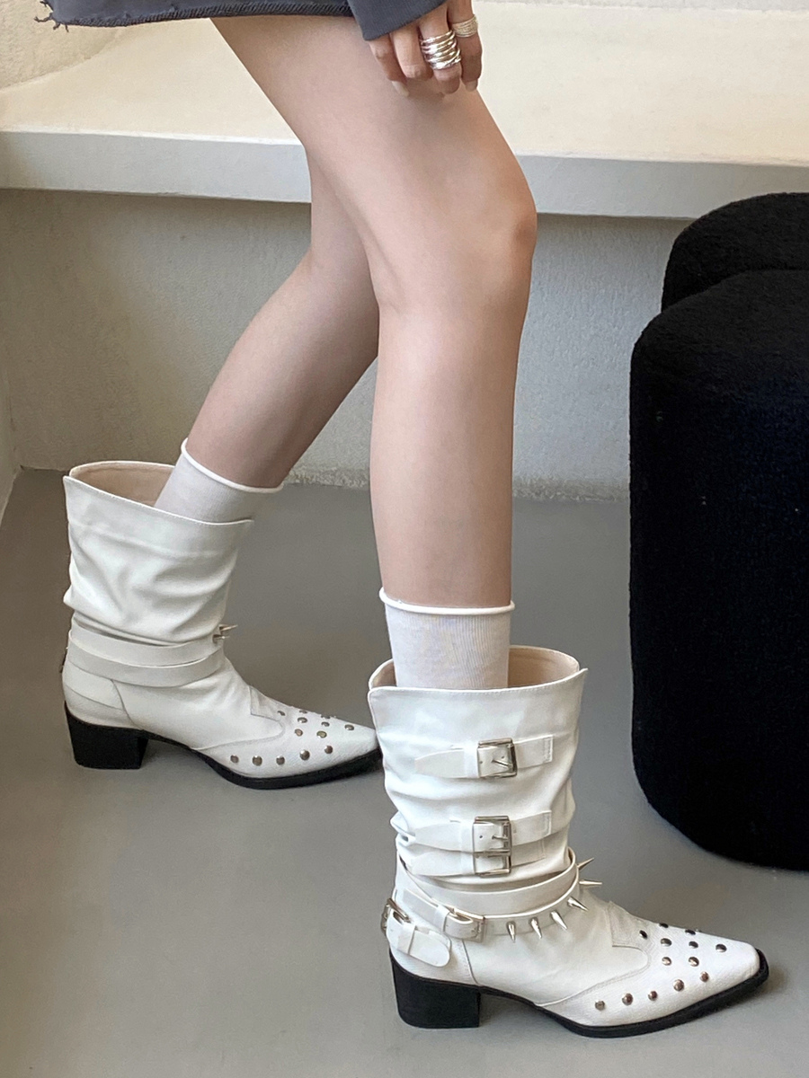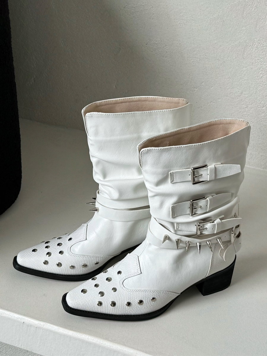 ホワイトアンクルブーツ レディース スクエアトゥ ビーズバックルディテール ブーティ
