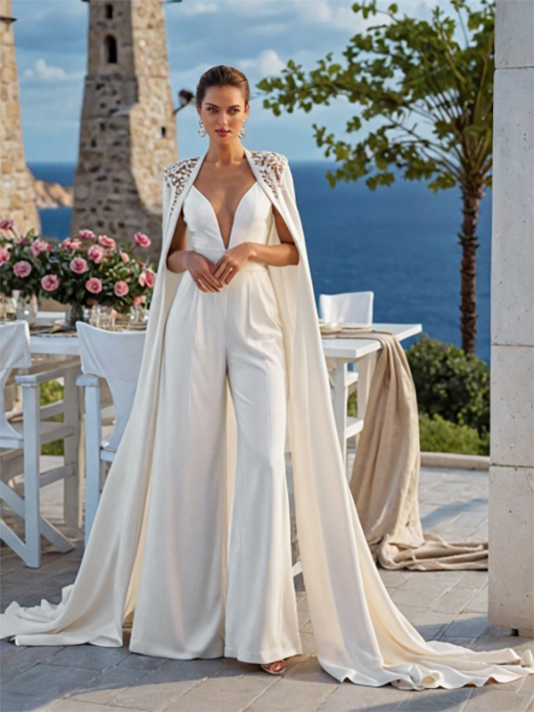 ブライダルジャンプスーツ レース フロアレングス ツーピース Vネック ノースリーブ ナチュラルウエスト ホワイト
