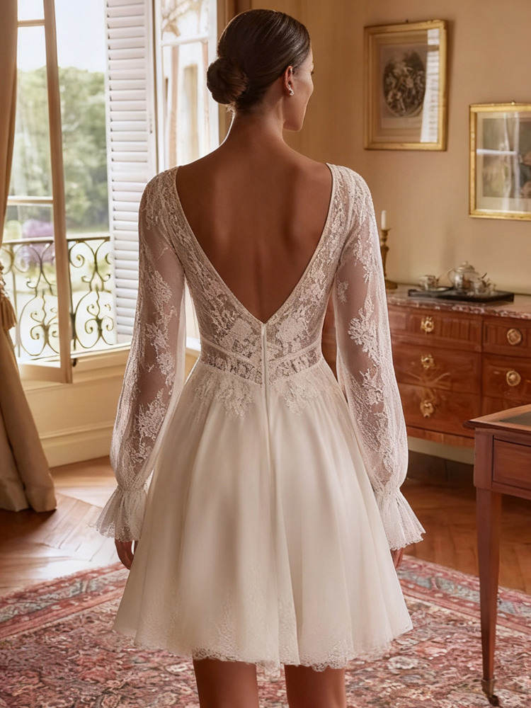 ショート丈ウェディングドレス Vネック 長袖 ショート丈 ショート丈 ブライダルドレス