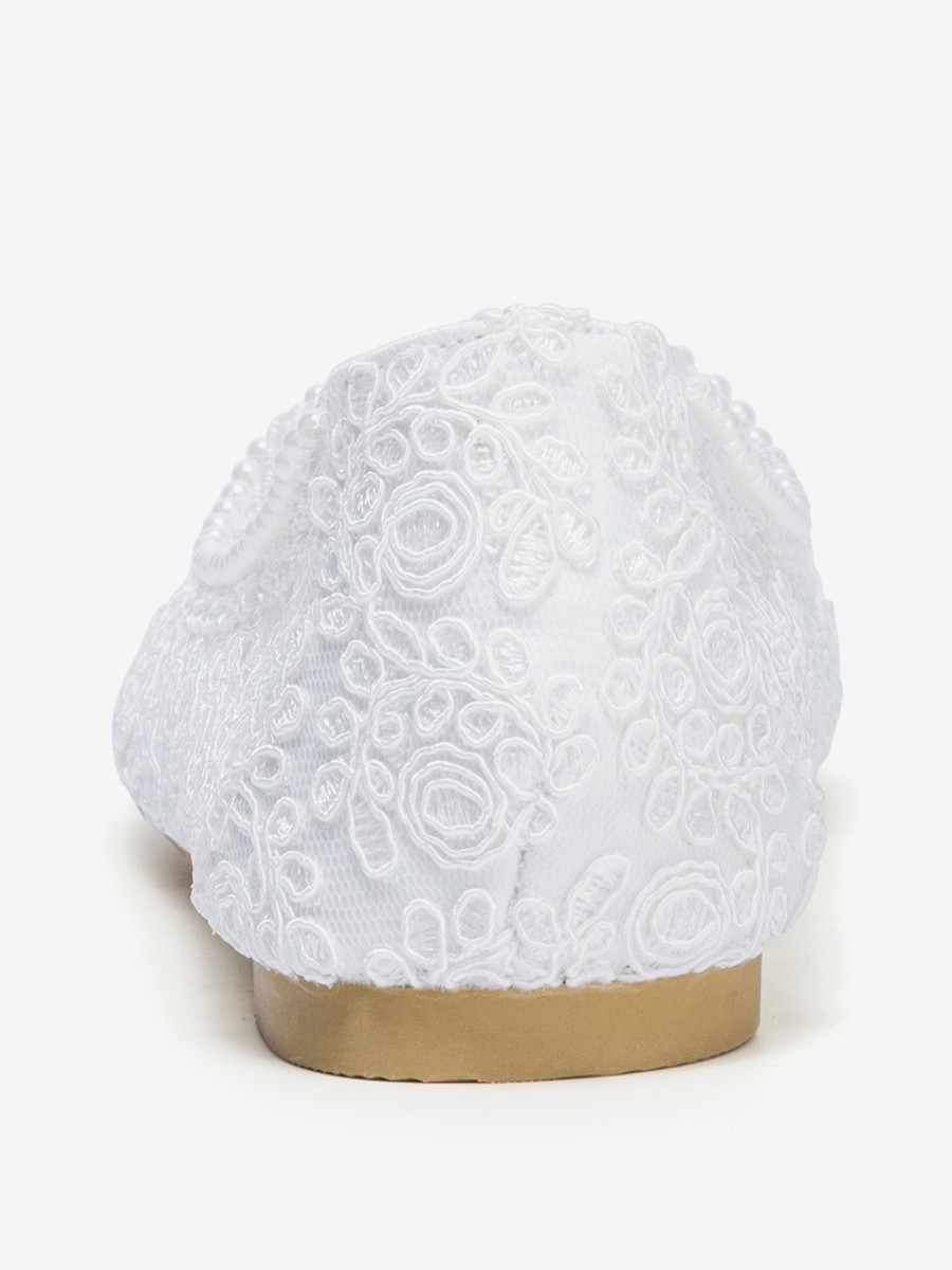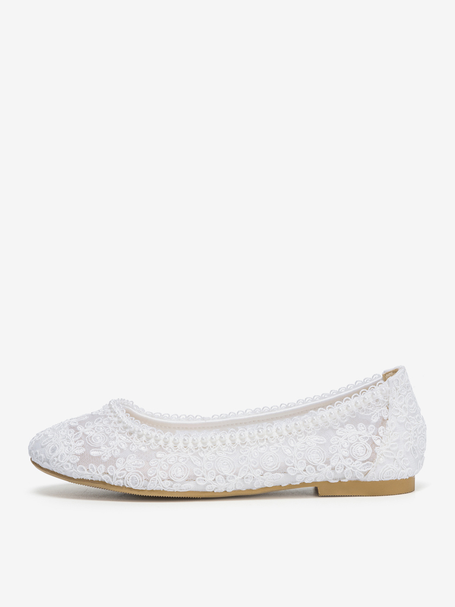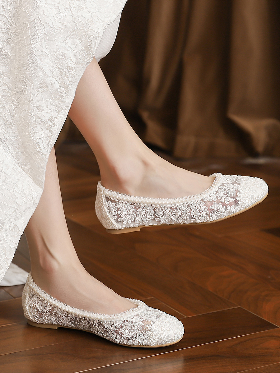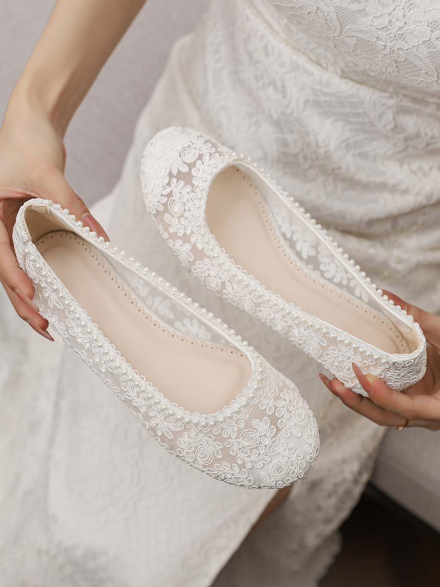 フラットブライダルシューズ ラウンドトゥ パールレース ヴィンテージウェディングシューズ