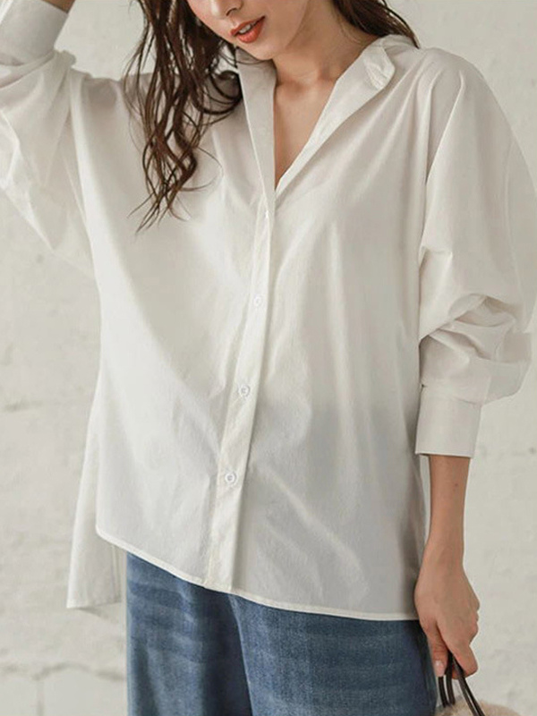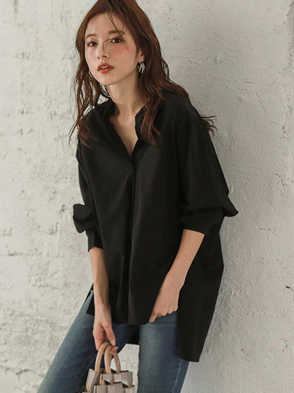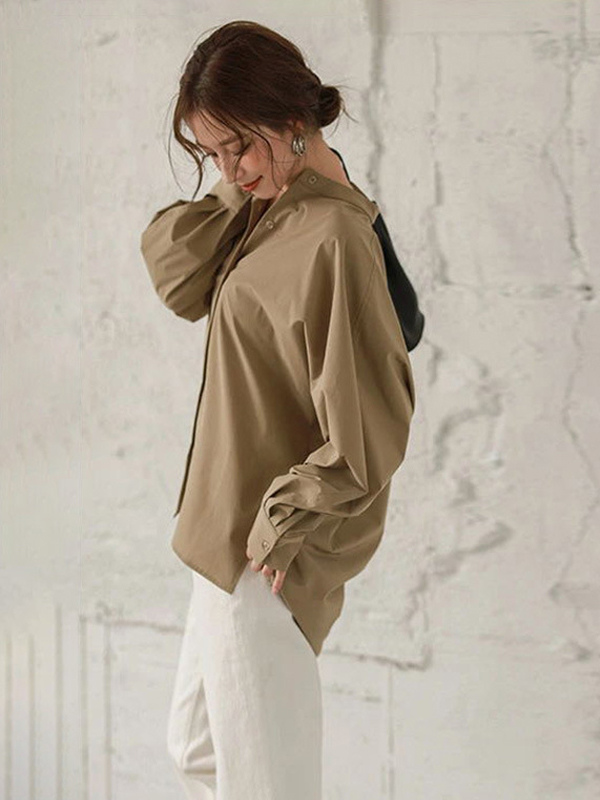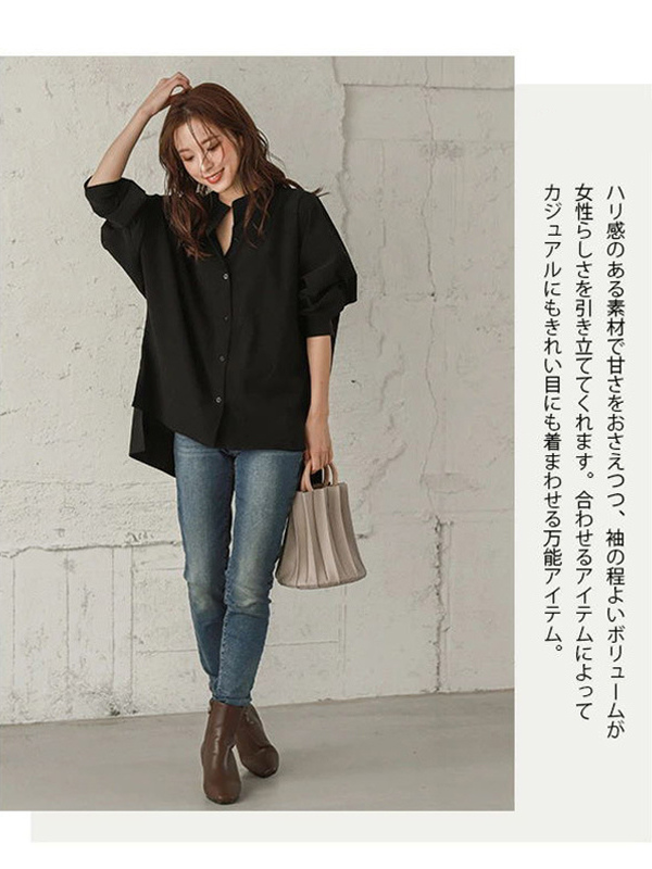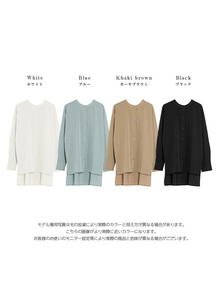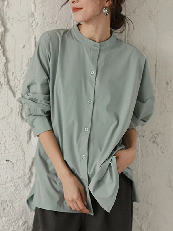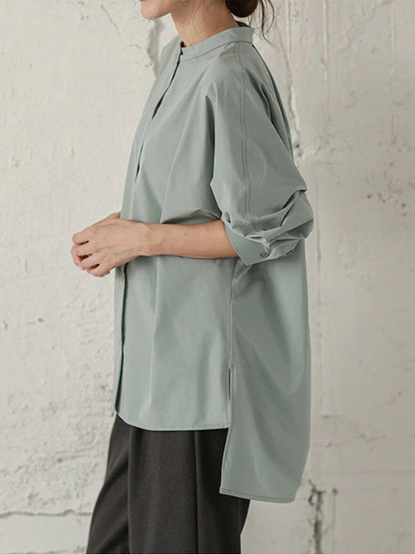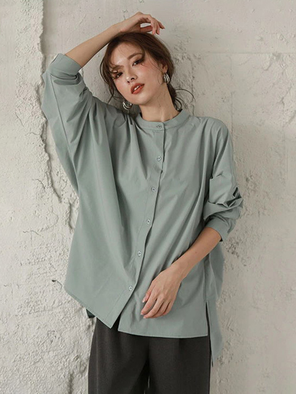 カジュアルスタンドカラーバットウィングスリーブイリュージョンブルーロングスリーブハイローデザインボタントップシャツとブラウストップスレディースファッション
