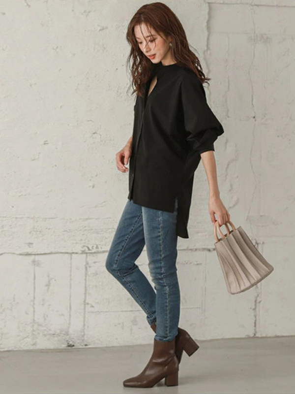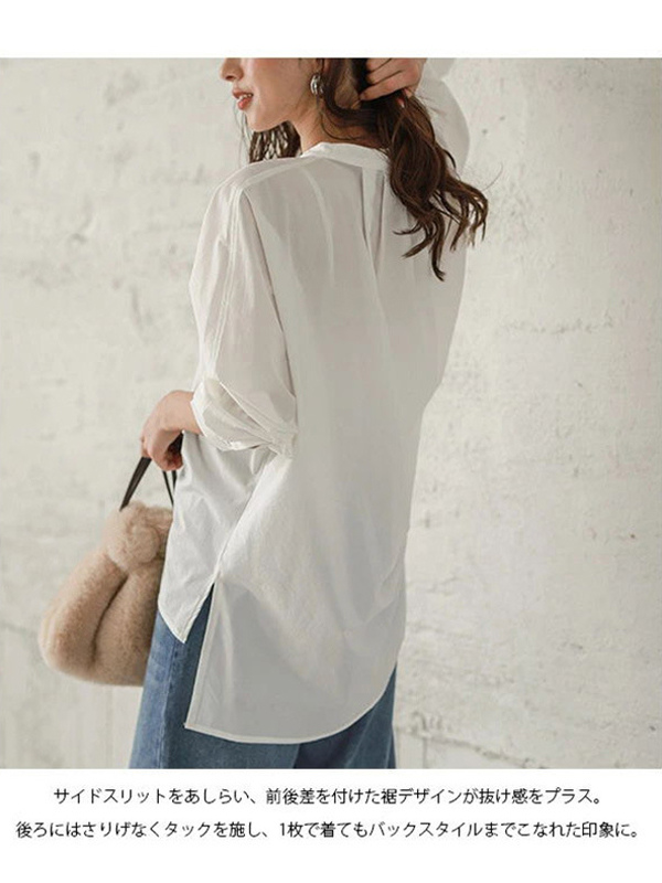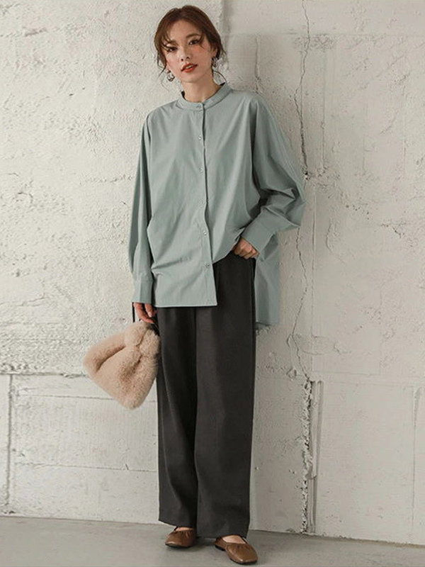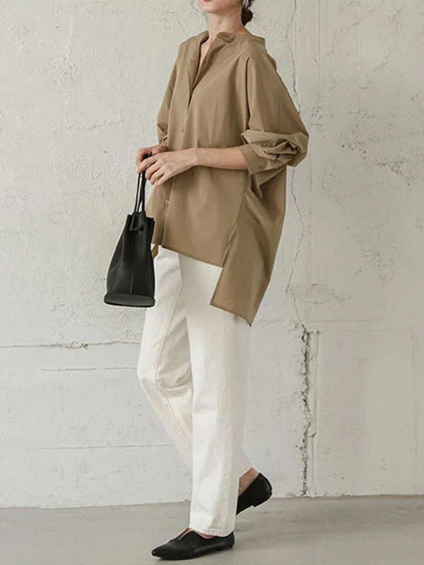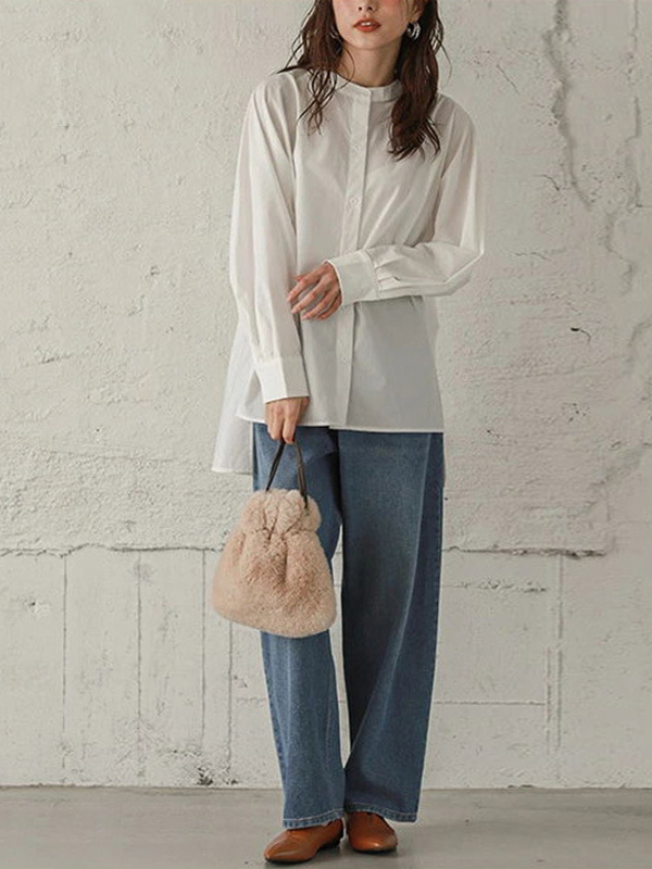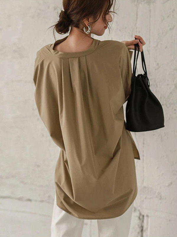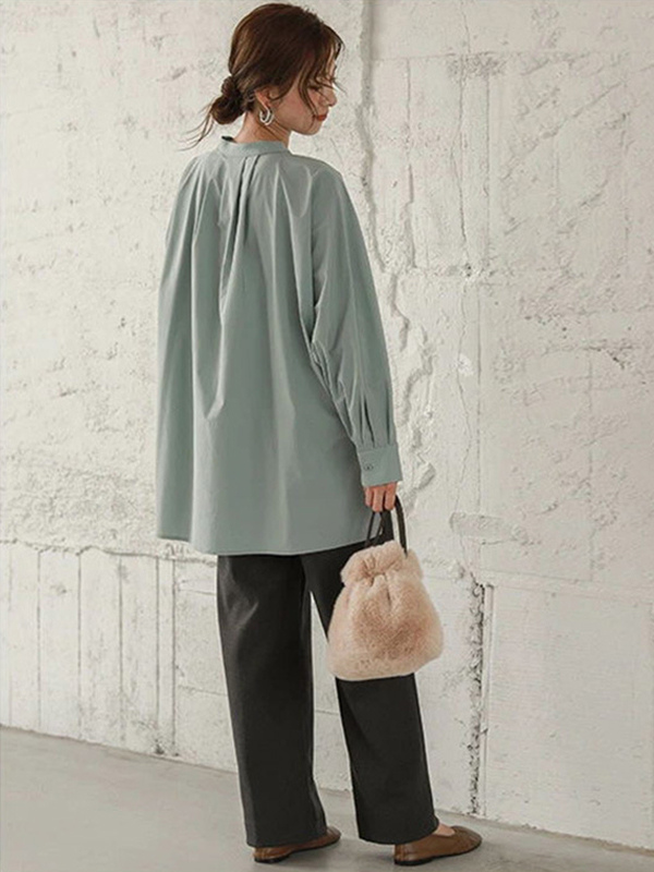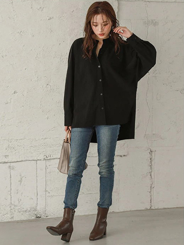 カジュアルスタンドカラーバットウィングスリーブイリュージョンブルーロングスリーブハイローデザインボタントップシャツとブラウストップスレディースファッション
