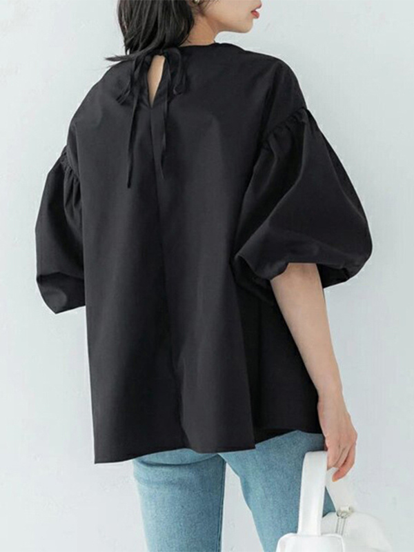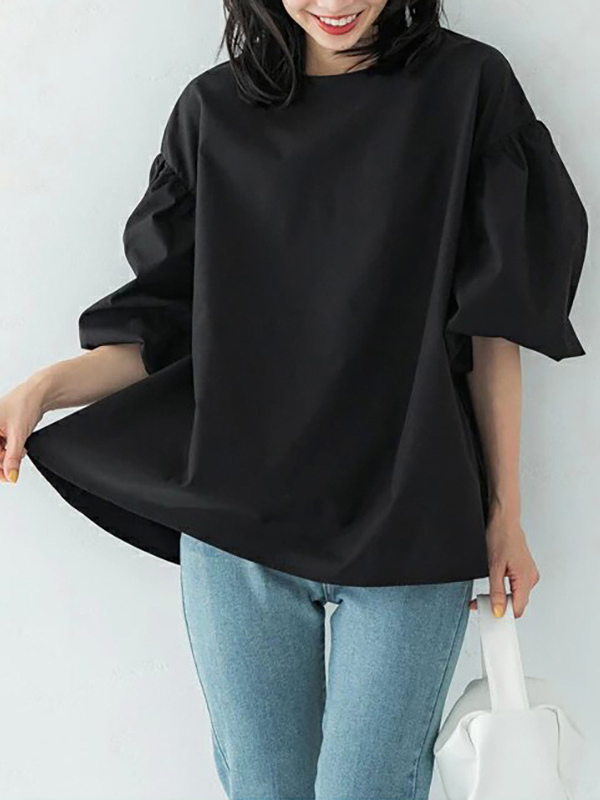カジュアルジュエルネックパフスリーブダークローズハーフスリーブプリーツトップスシャツ&ブラウストップスレディースファッション