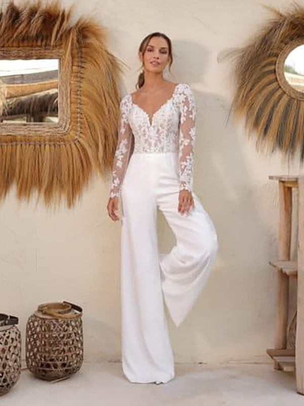 ブライダルジャンプスーツ レース フロア丈 ジャンプスーツ デザインネックライン 取り外し可能 長袖 ナチュラルウエスト アイボリー