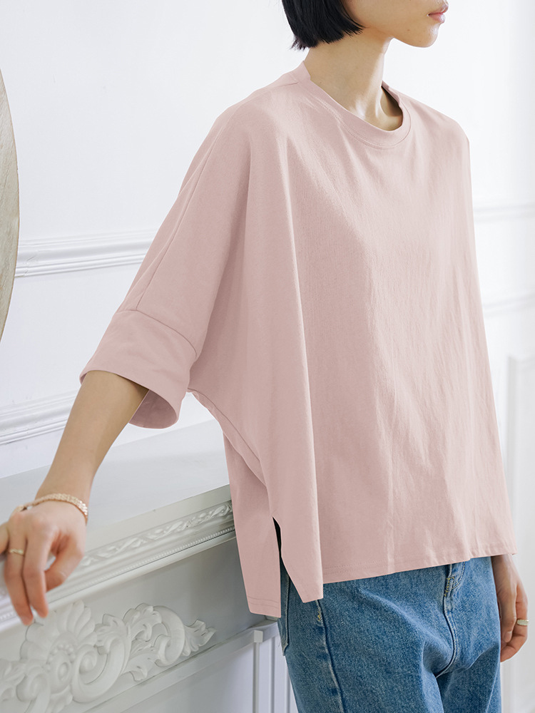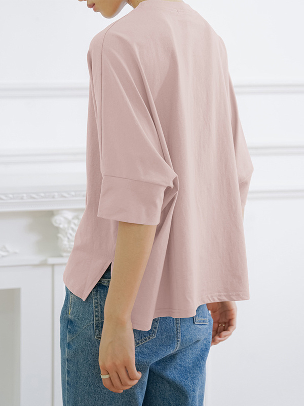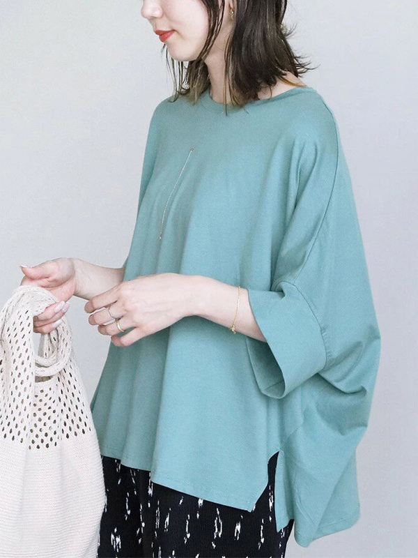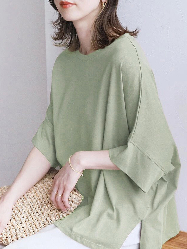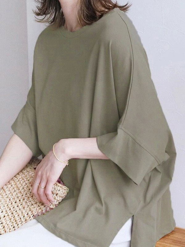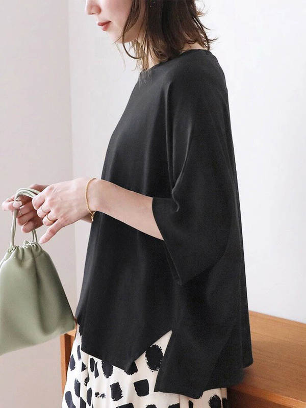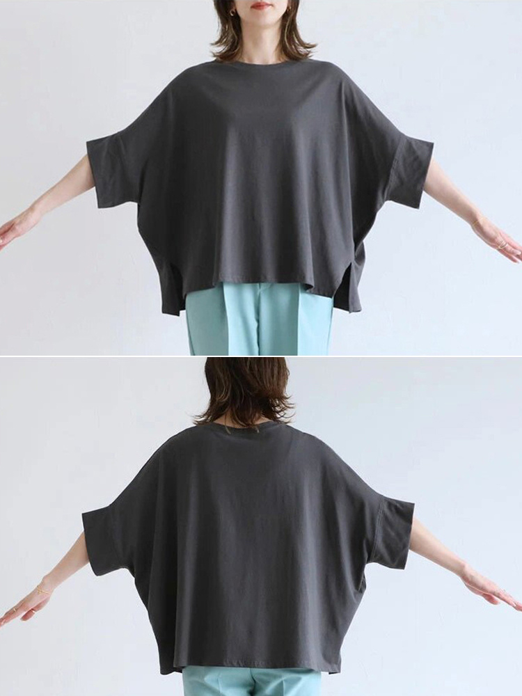 カジュアル ジュエルネック ディープグレー ハーフスリーブ スプリットフロントトップ Tシャツ トップス レディース ファッション