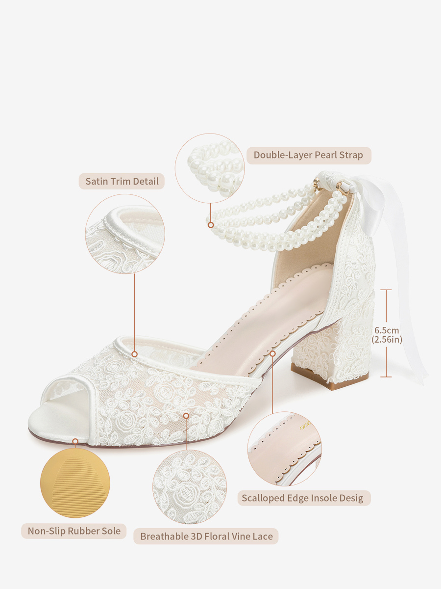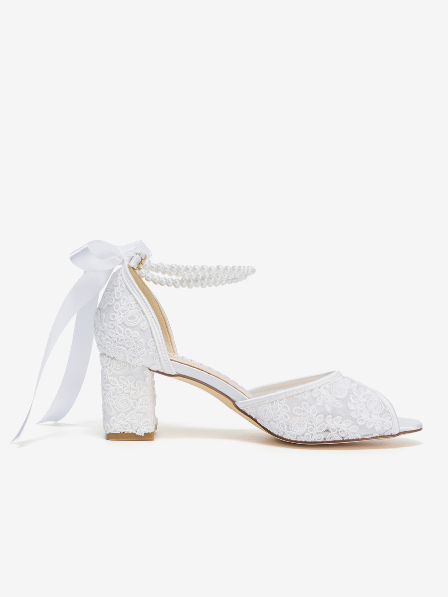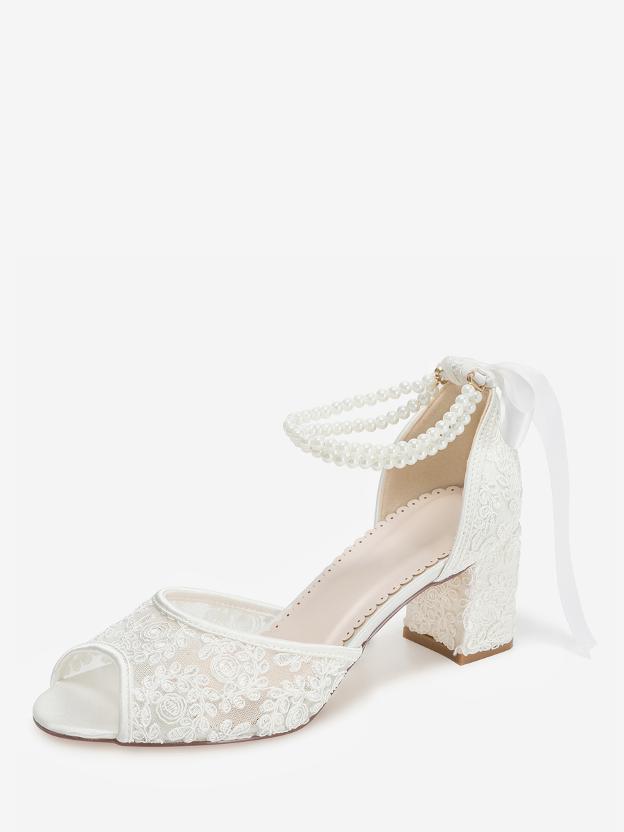 レースのウェディングシューズ、つま先が見える花柄ビーズパールのチャンキーヒールのブライダルシューズ