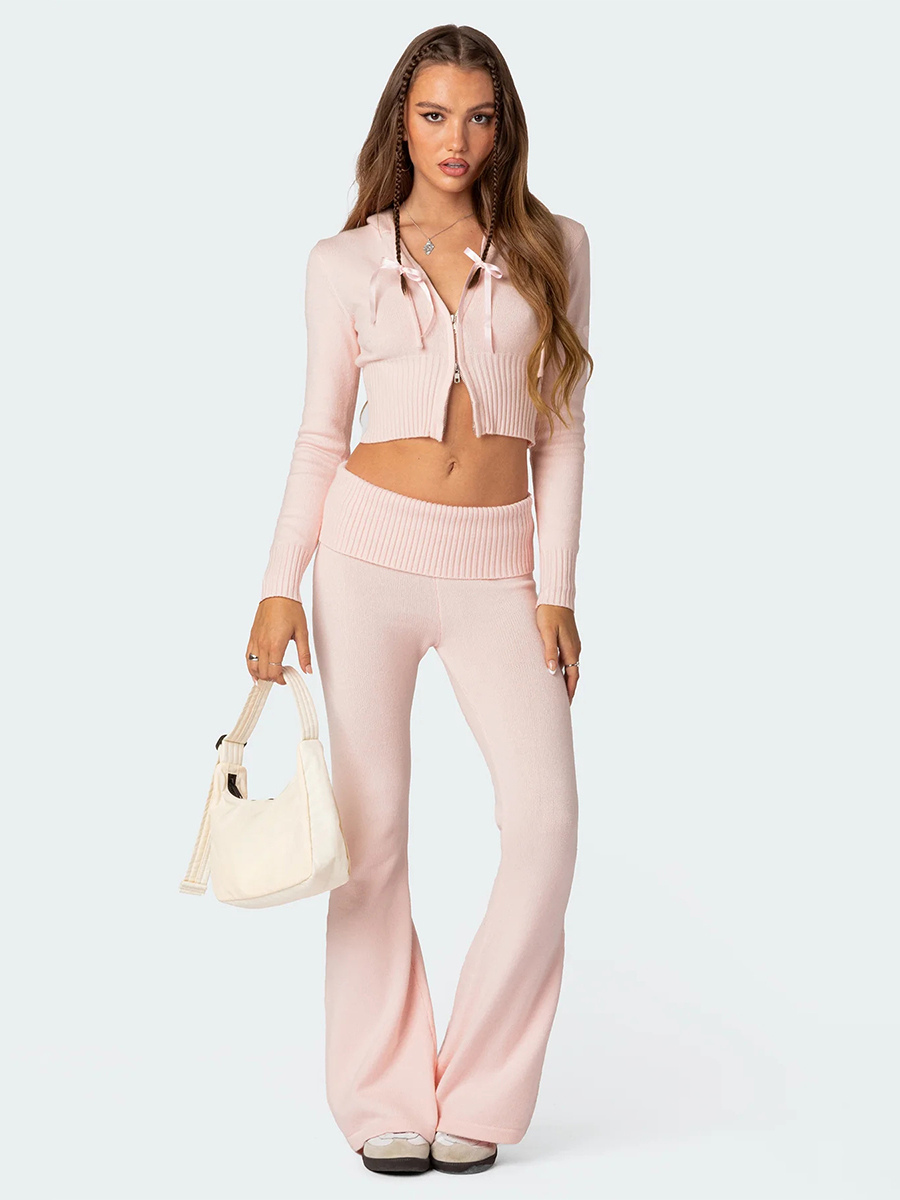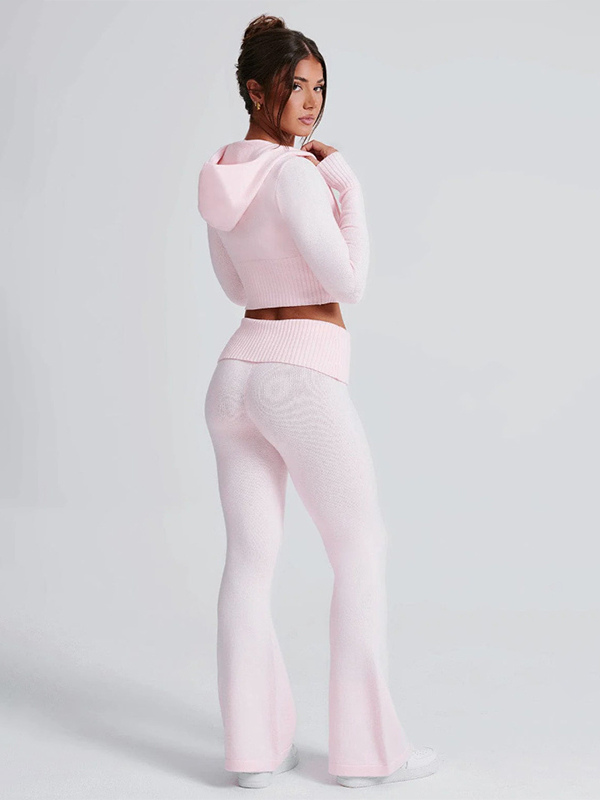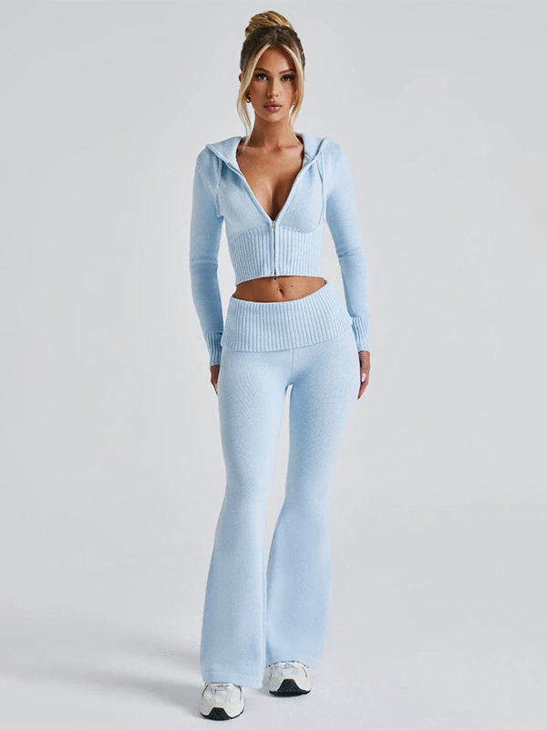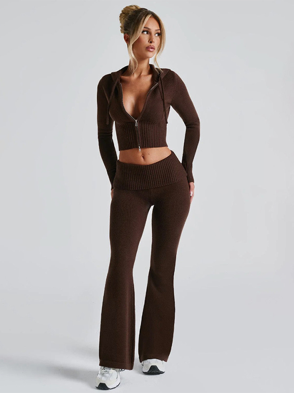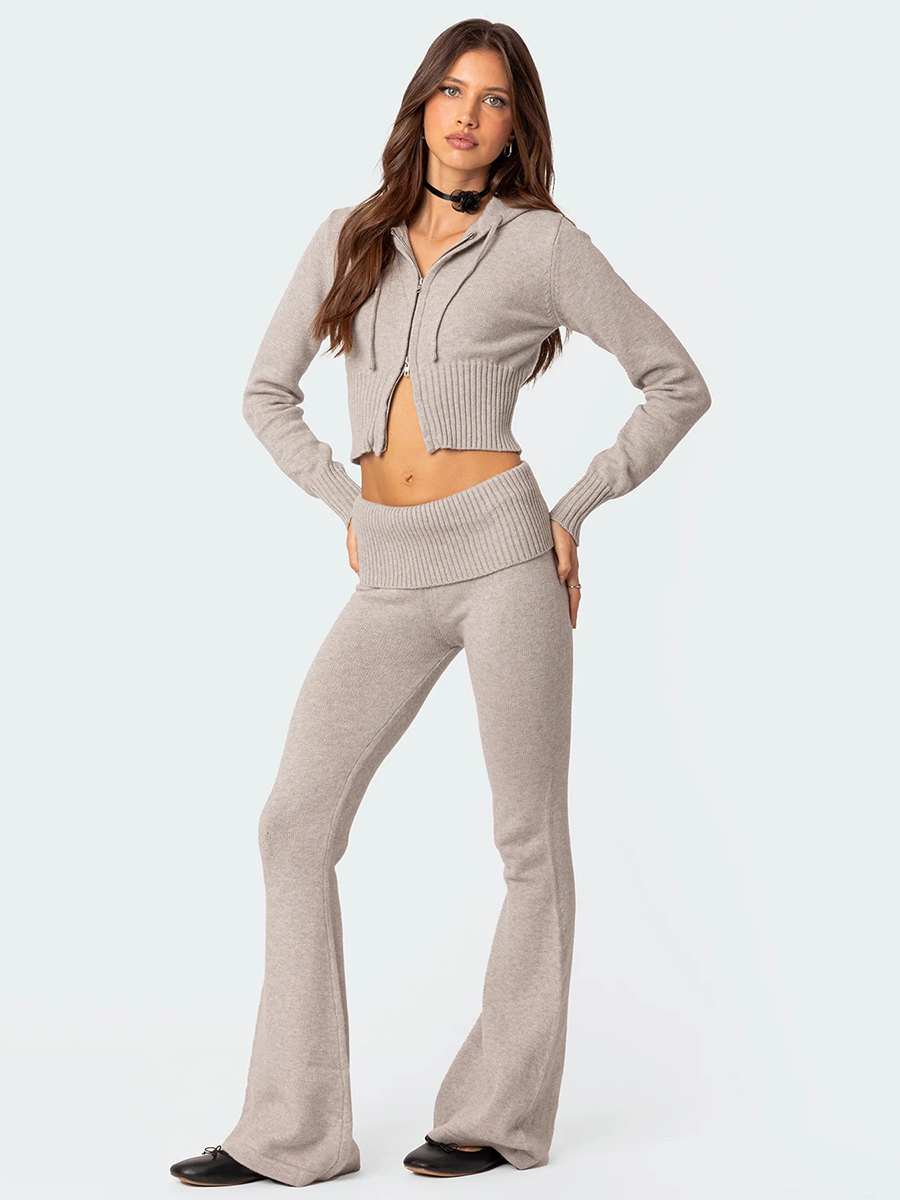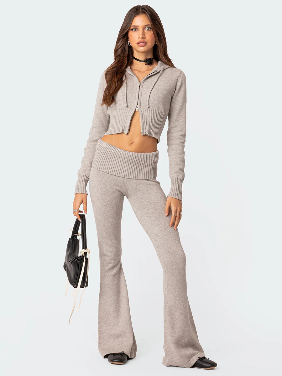ニットクロップドジップアップパーカーとフレアパンツのツーピースコーデセット(レディース 2025年)