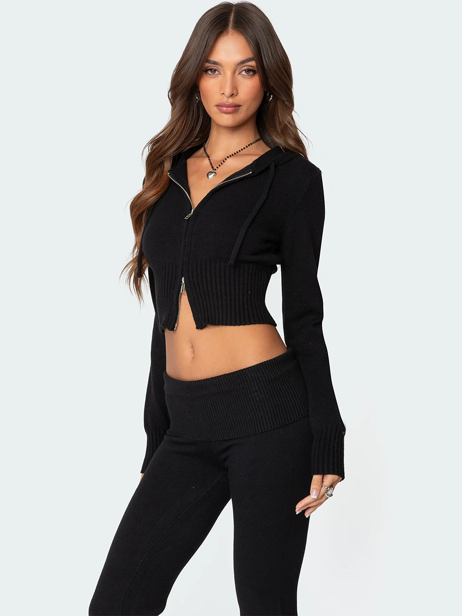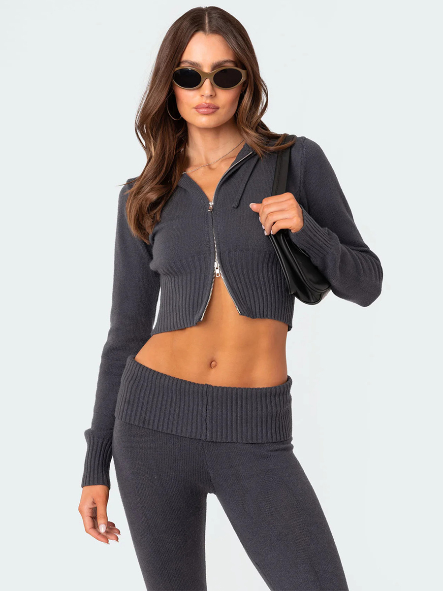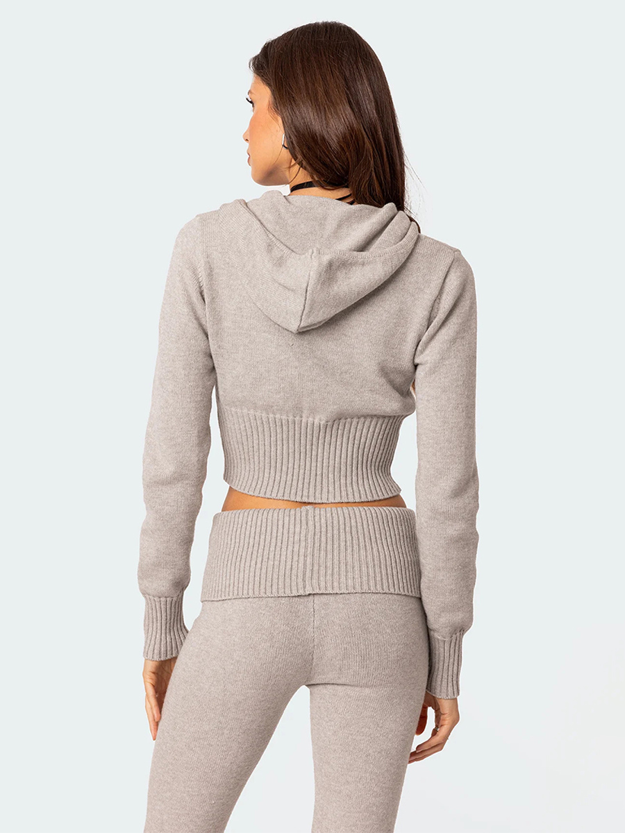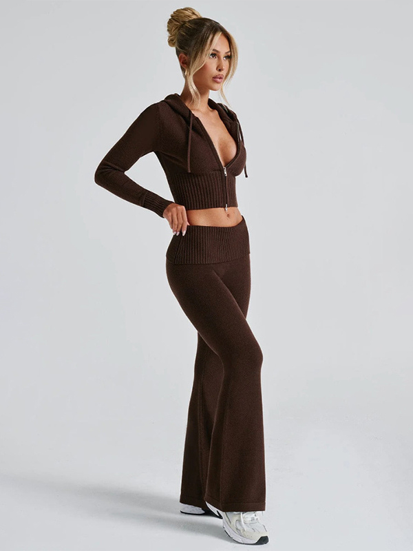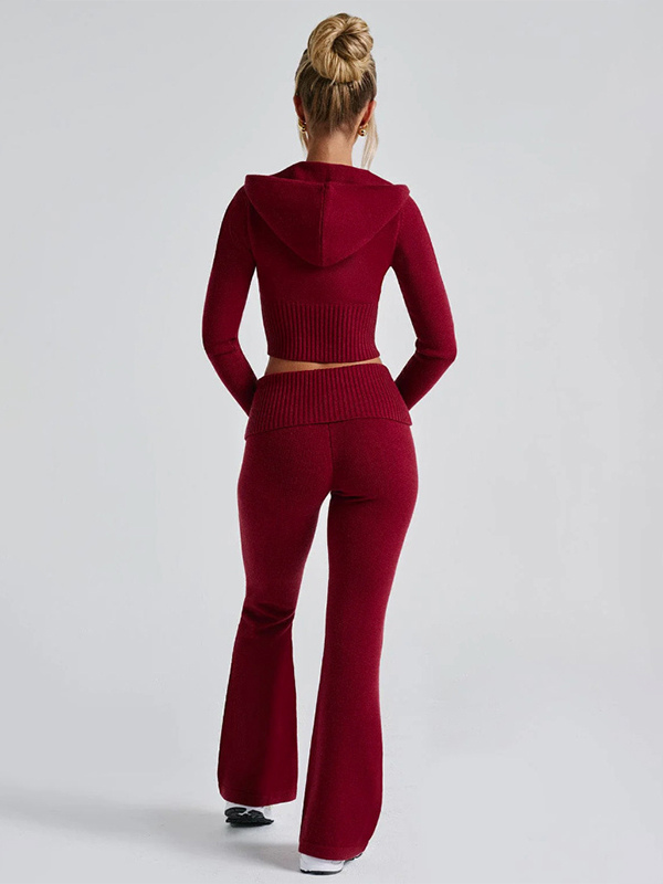 ニットクロップドジップアップパーカーとフレアパンツのツーピースコーデセット(レディース 2025年)