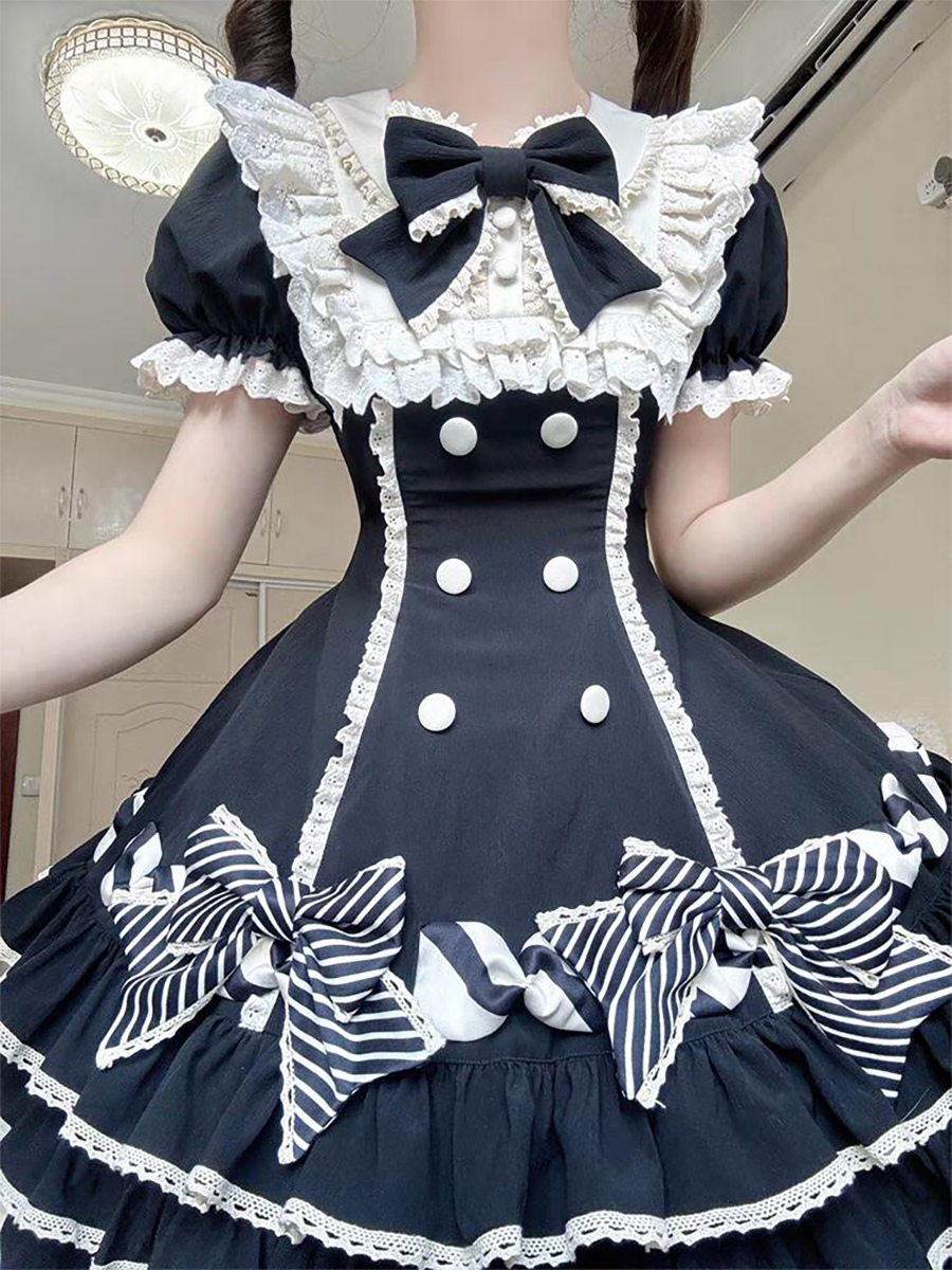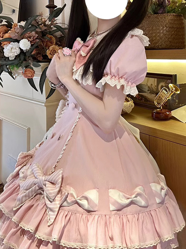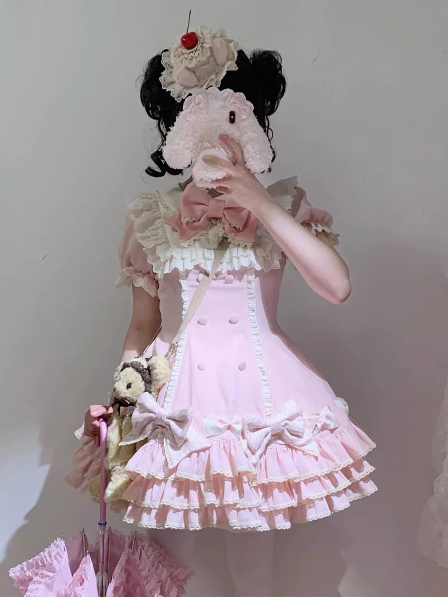 スイートロリータドレスケーキ半袖フリルリボンドレス甘いピンクのロリータドレス帽子付き