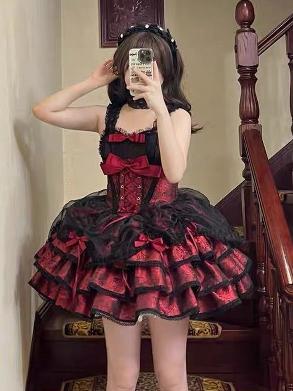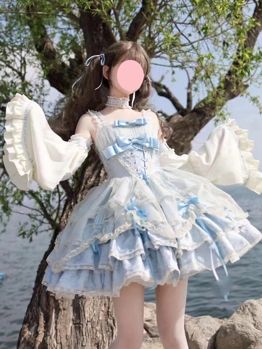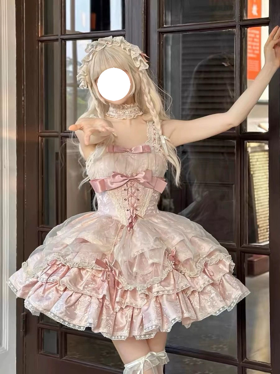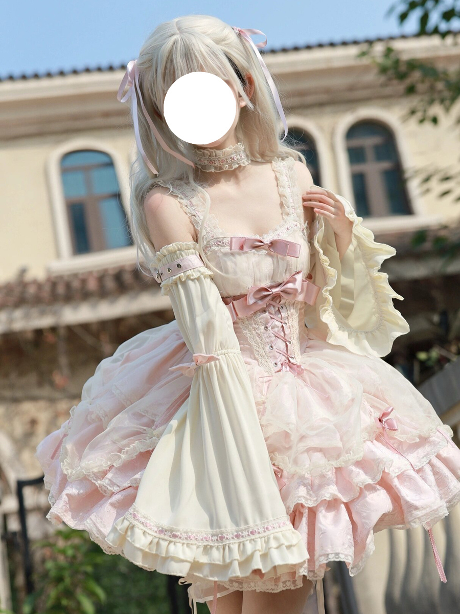スイートバレエロリータドレス、取り外し可能な袖、レースアップ、ピンクのジャンパースカート、チョーカー付きドレス