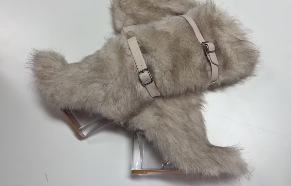 レディース フェイクファーブーツ ラウンドトゥ 透明ウェッジヒール ニーハイブーツ