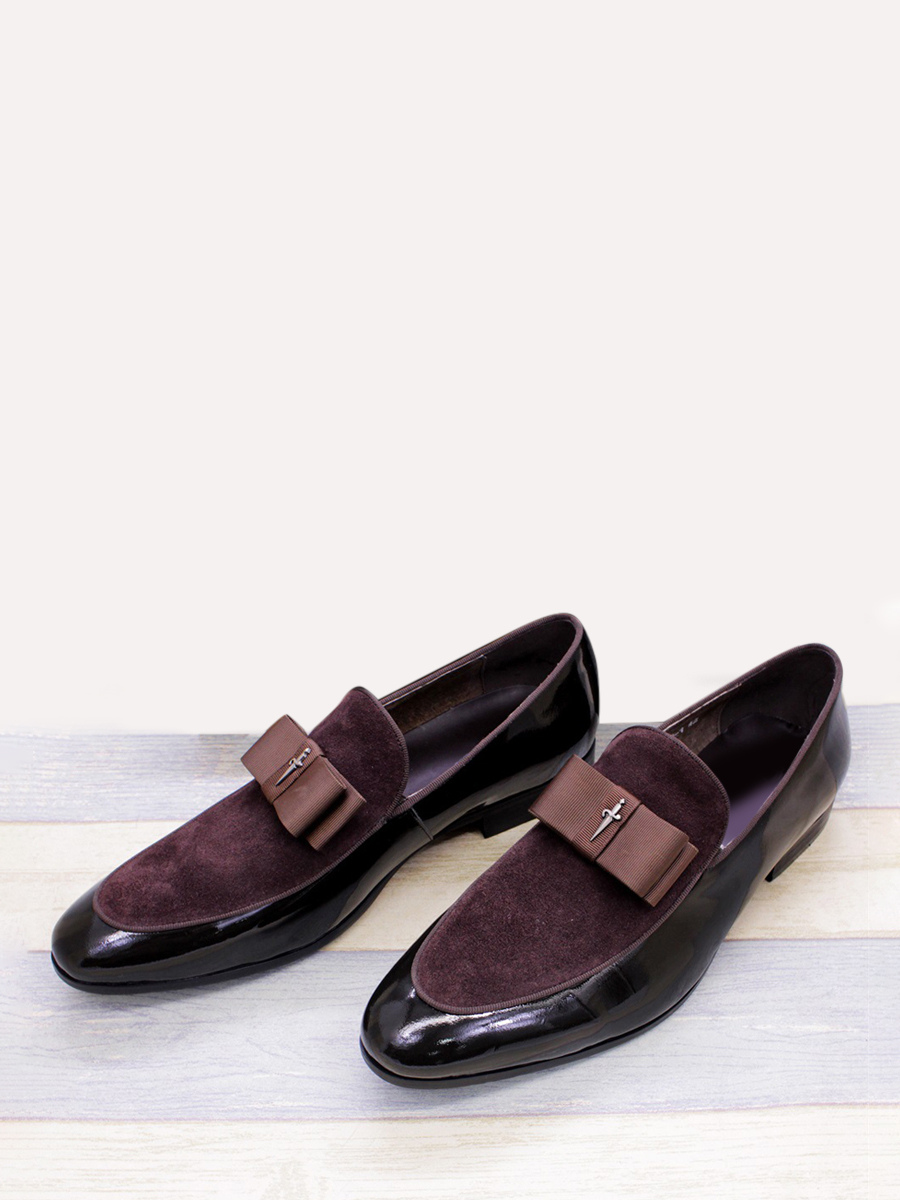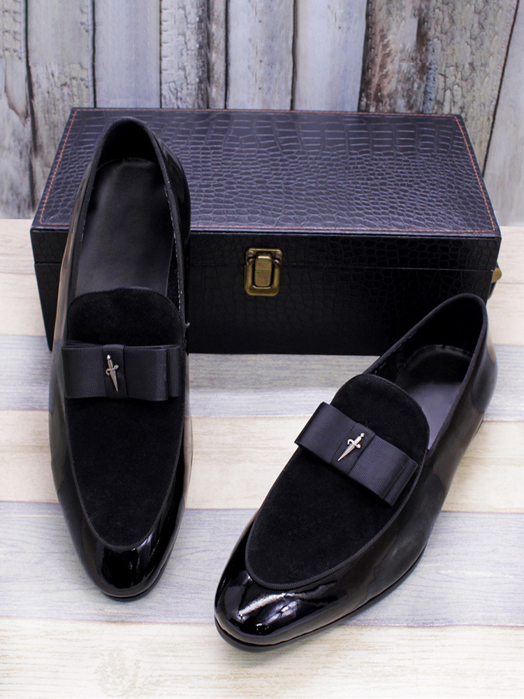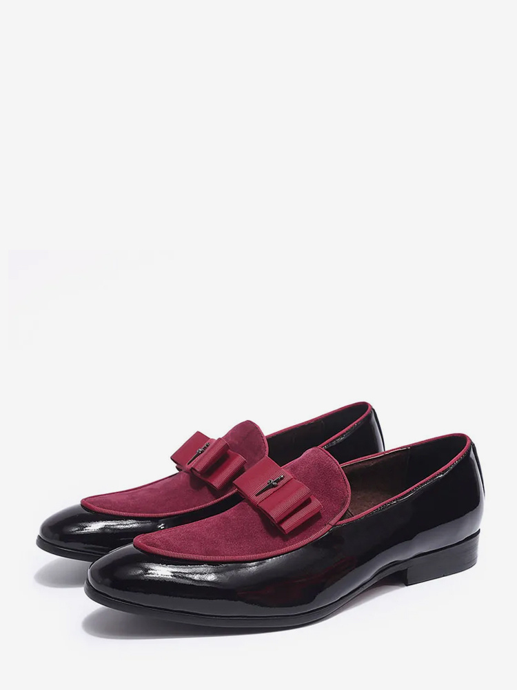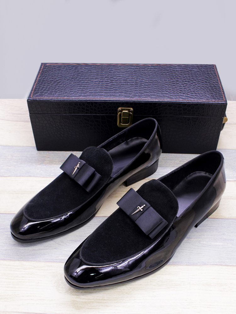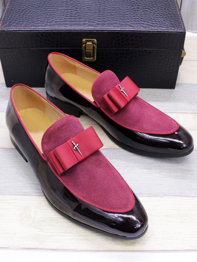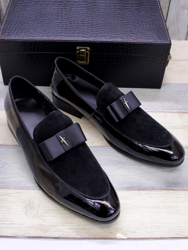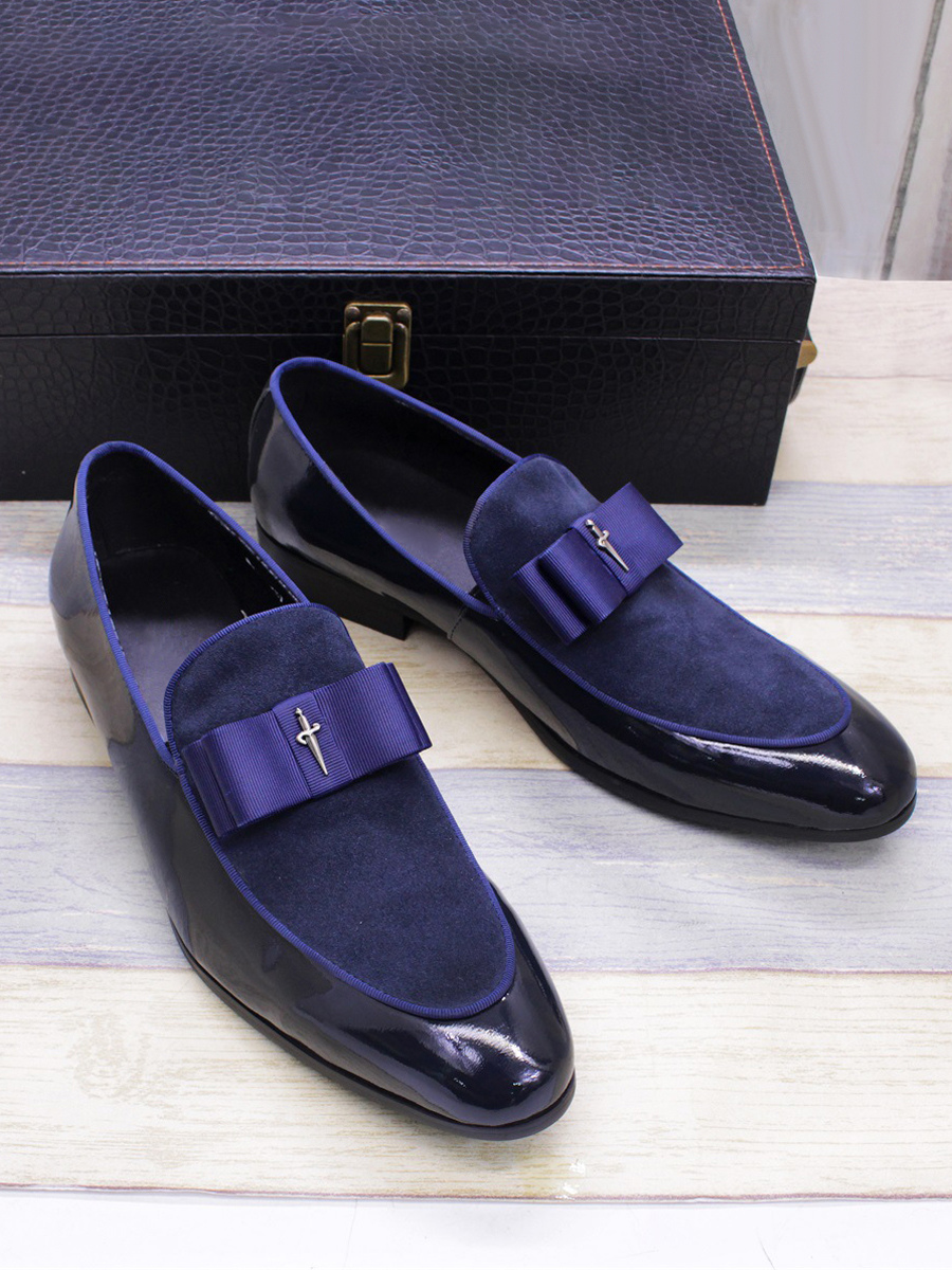 メンズドレスローファー 本革 ラウンドトゥ パッチワーク ボウ スリッポン プロムシューズ