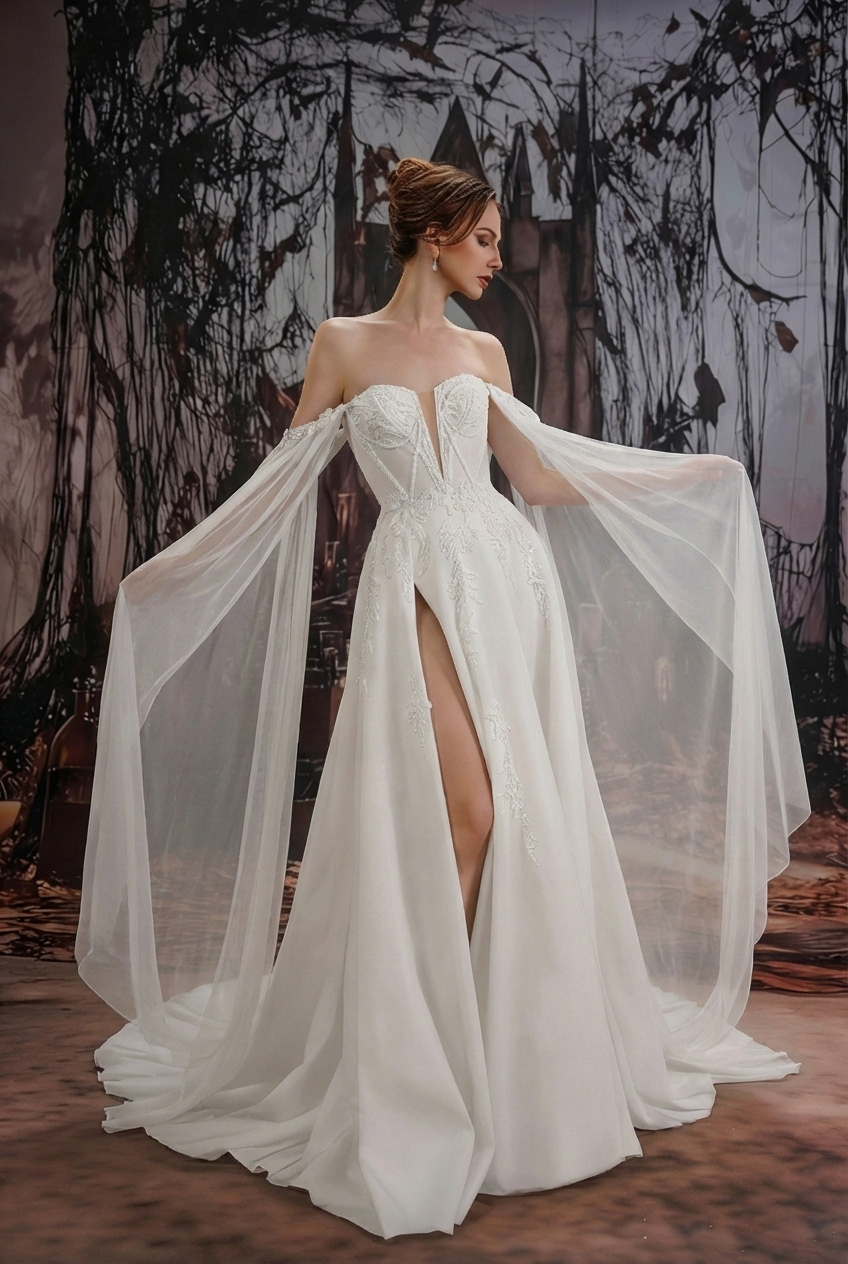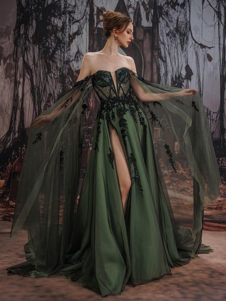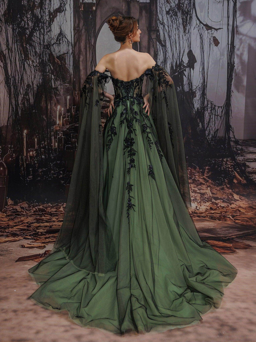 ゴシックブラックウェディングドレス、レースAライン、ロングスリーブ、ナチュラルウエスト、ティアードトレーン付きブライダルドレス
