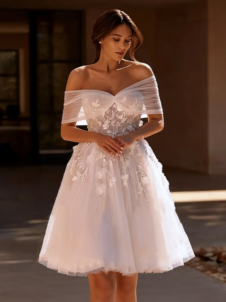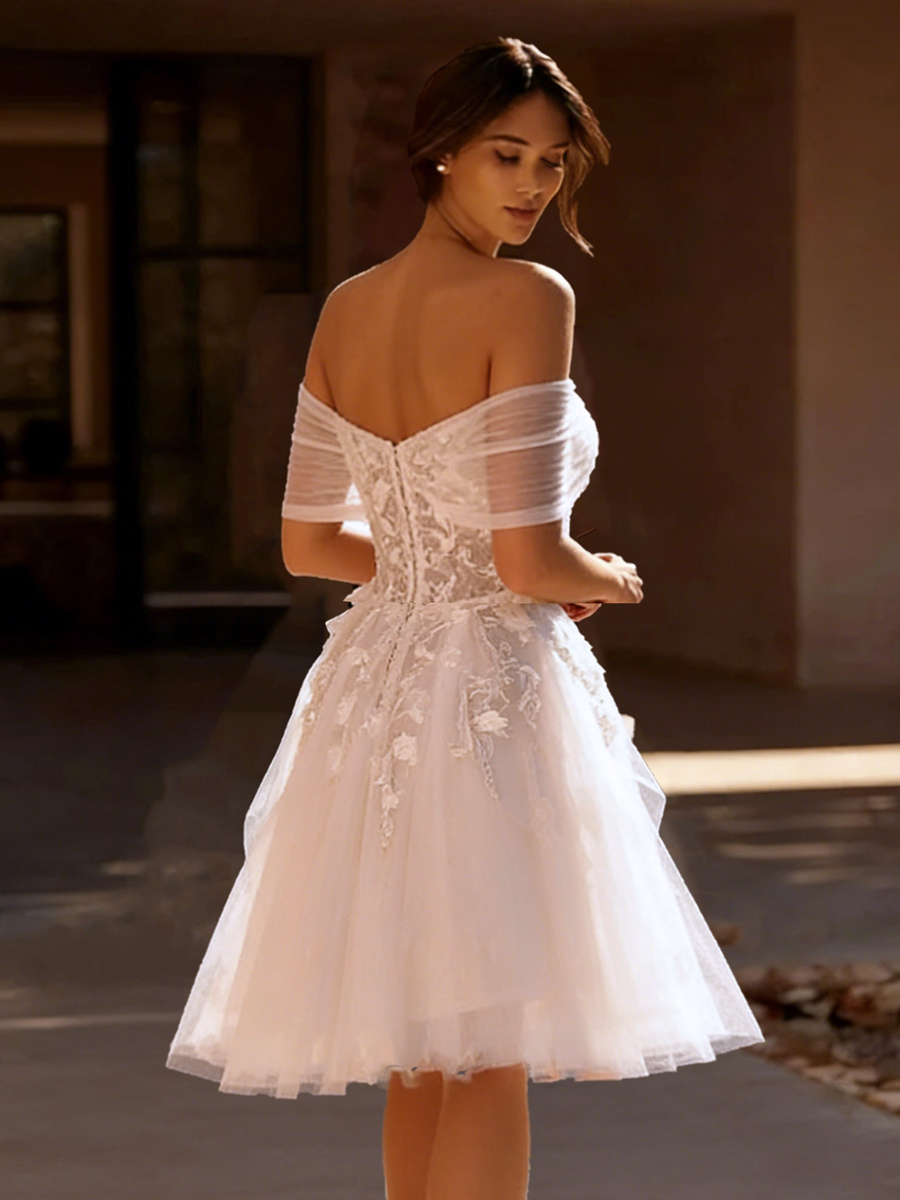 ショートウェディングドレス、デザインネックライン、ショートスリーブ、Aライン、ショートブライダルガウン