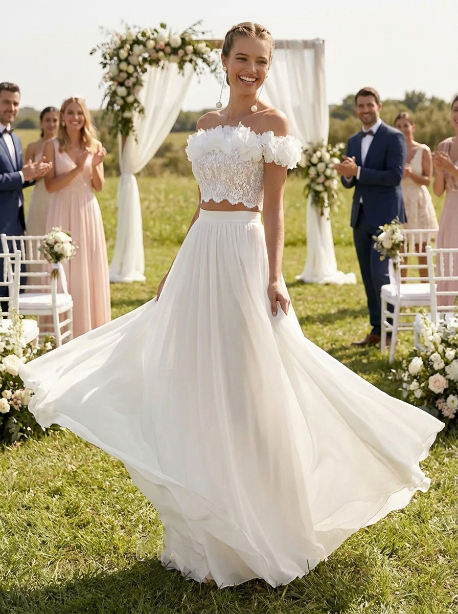 ツーピースウェディングドレス シフォンフラワー バトーネック ツーピース フロア丈 ジッパー ショートスリーブ フロア丈 ホワイト