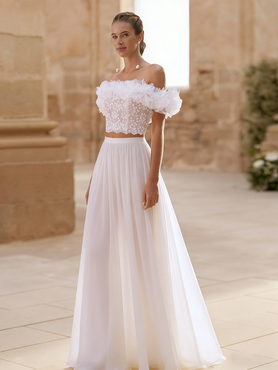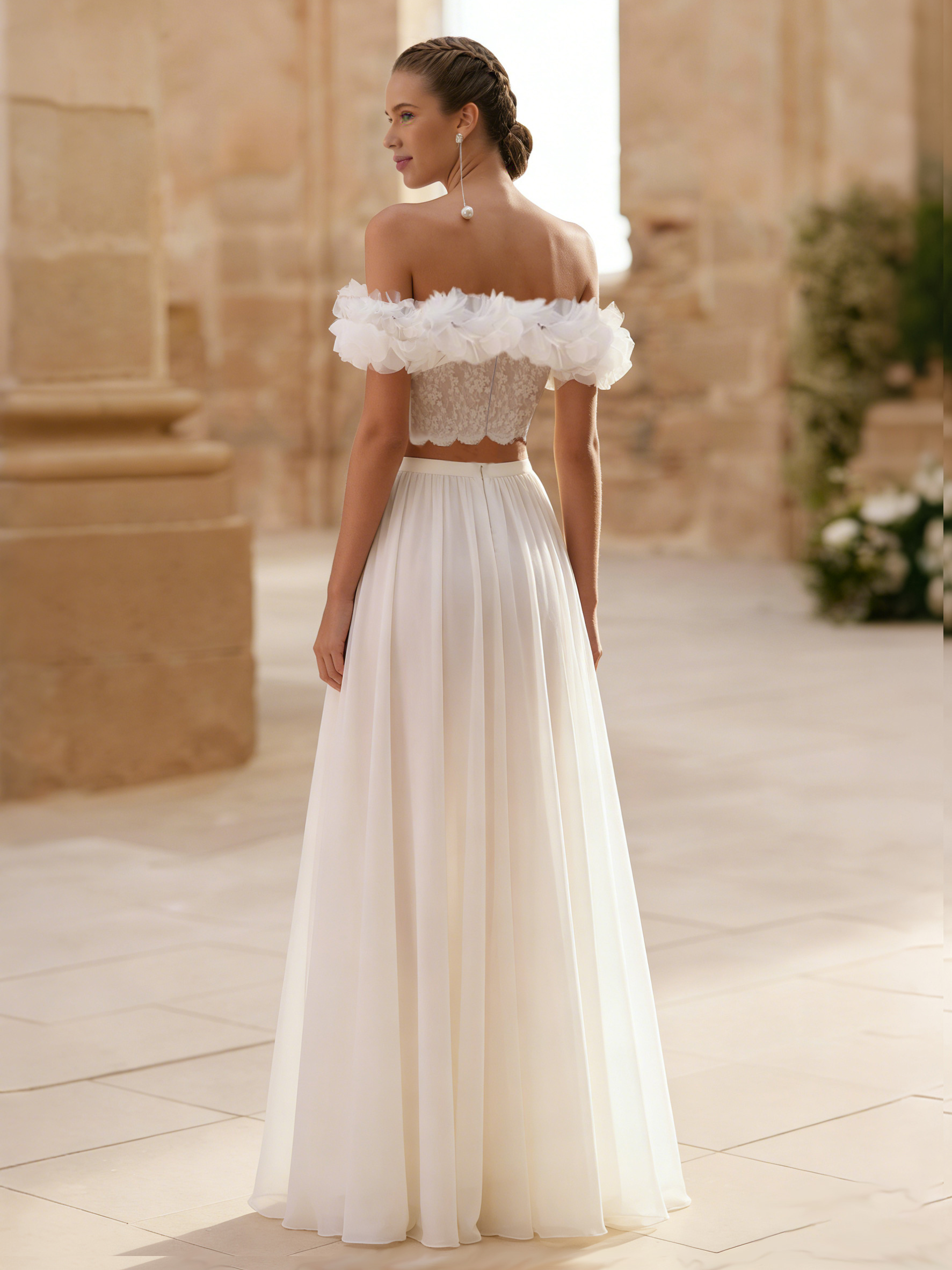 ツーピースウェディングドレス シフォンフラワー バトーネック ツーピース フロア丈 ジッパー ショートスリーブ フロア丈 ホワイト