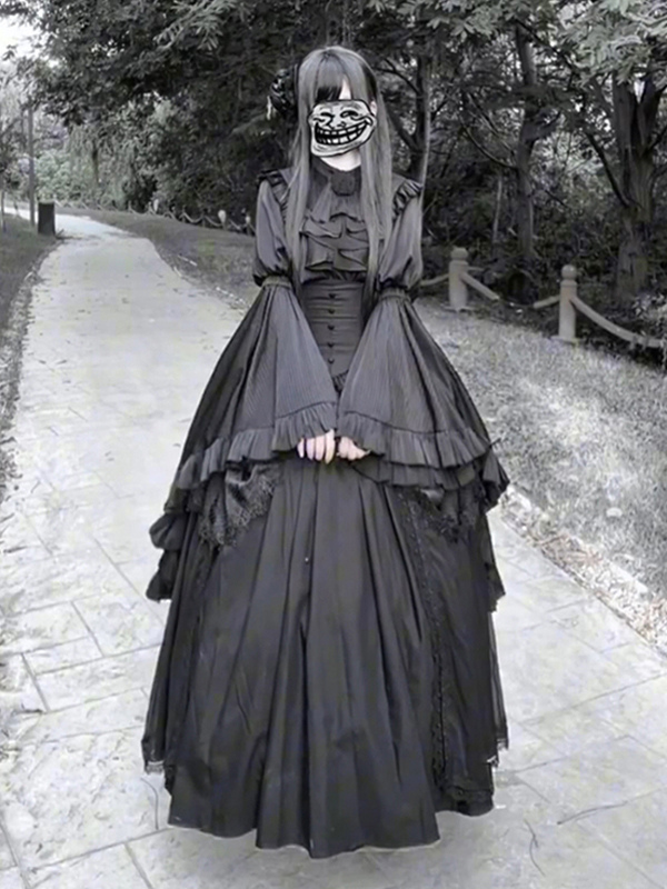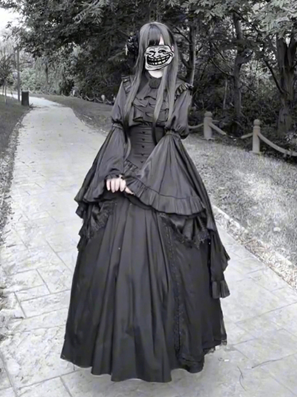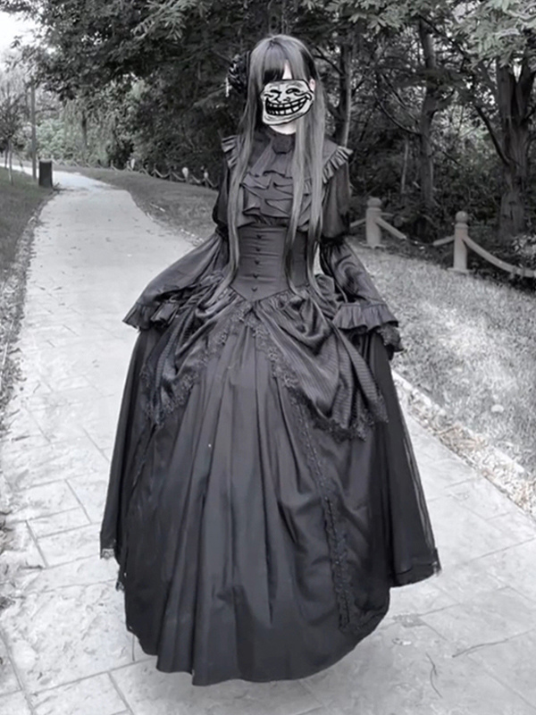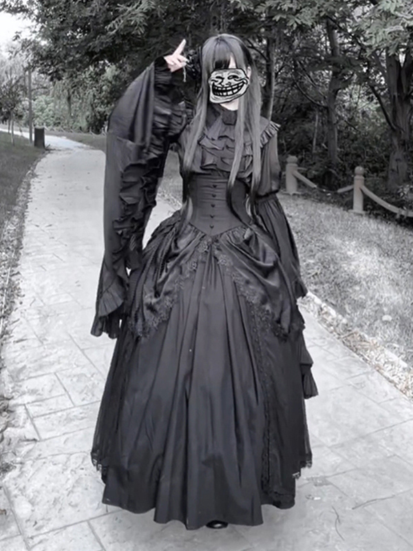 黒のゴシックロリータドレスファッション長袖ヴィンテージシックロングロリータドレス