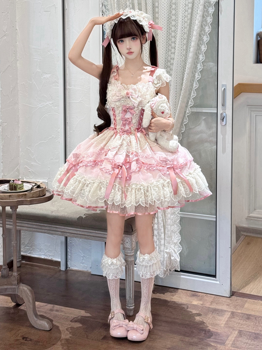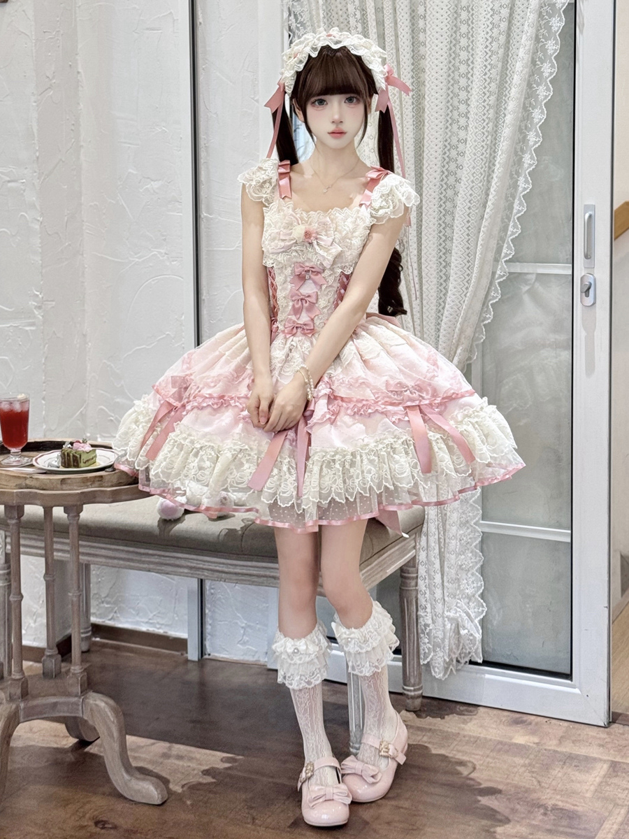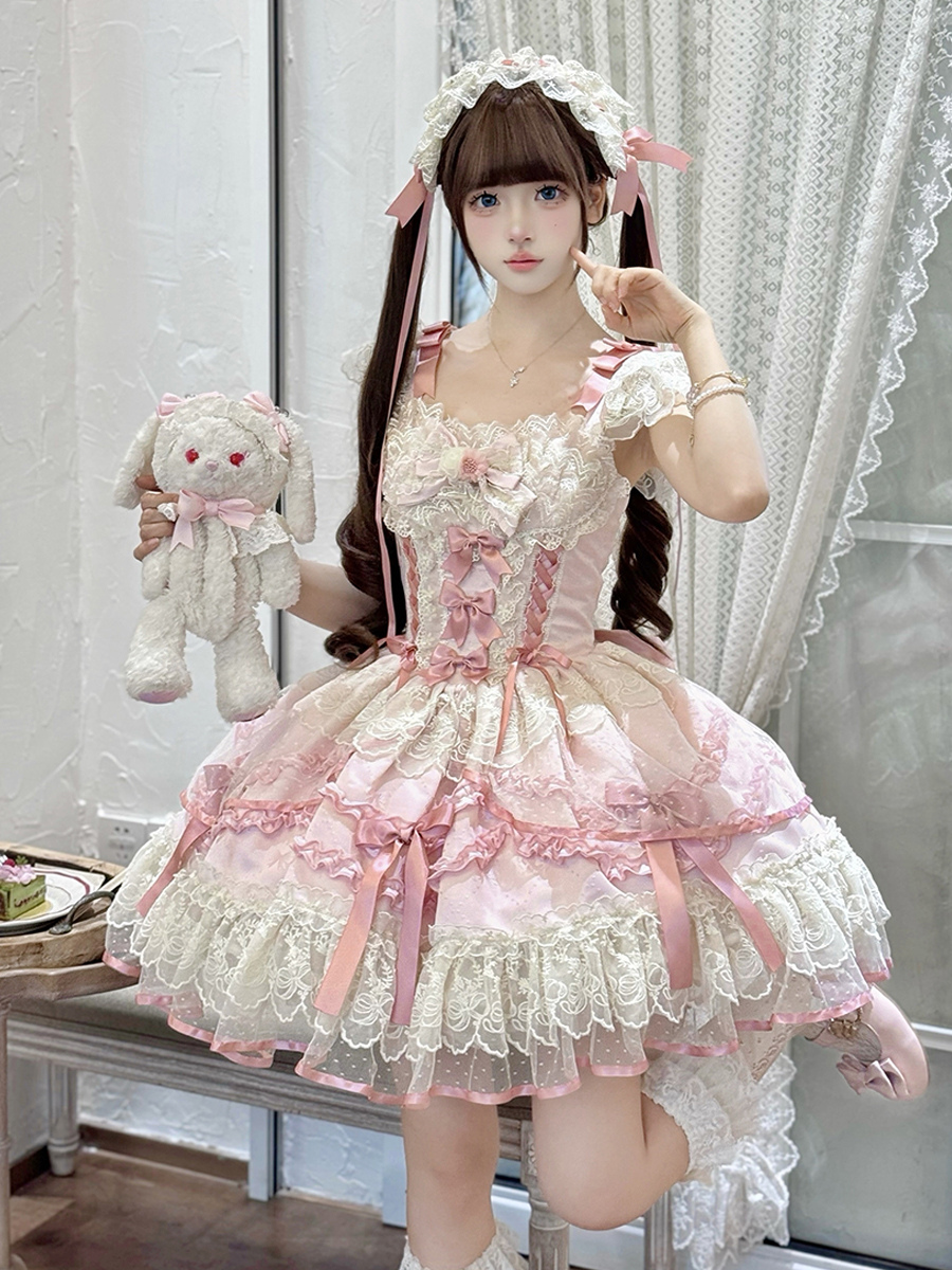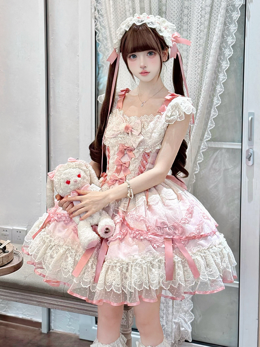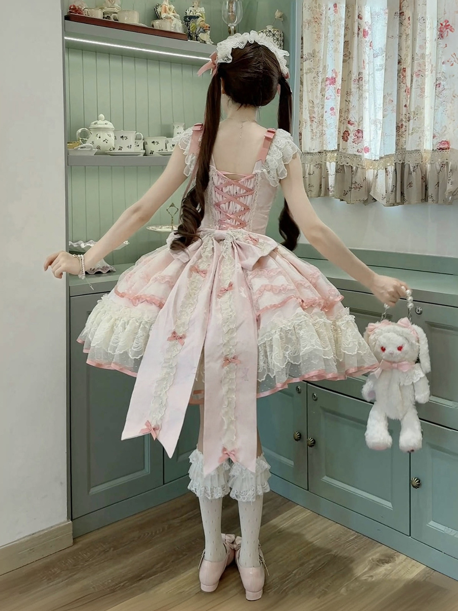 スイートロリータドレス ポリエステル ノースリーブ リボン スイートジャンパースカート ピンク ロリータドレス
