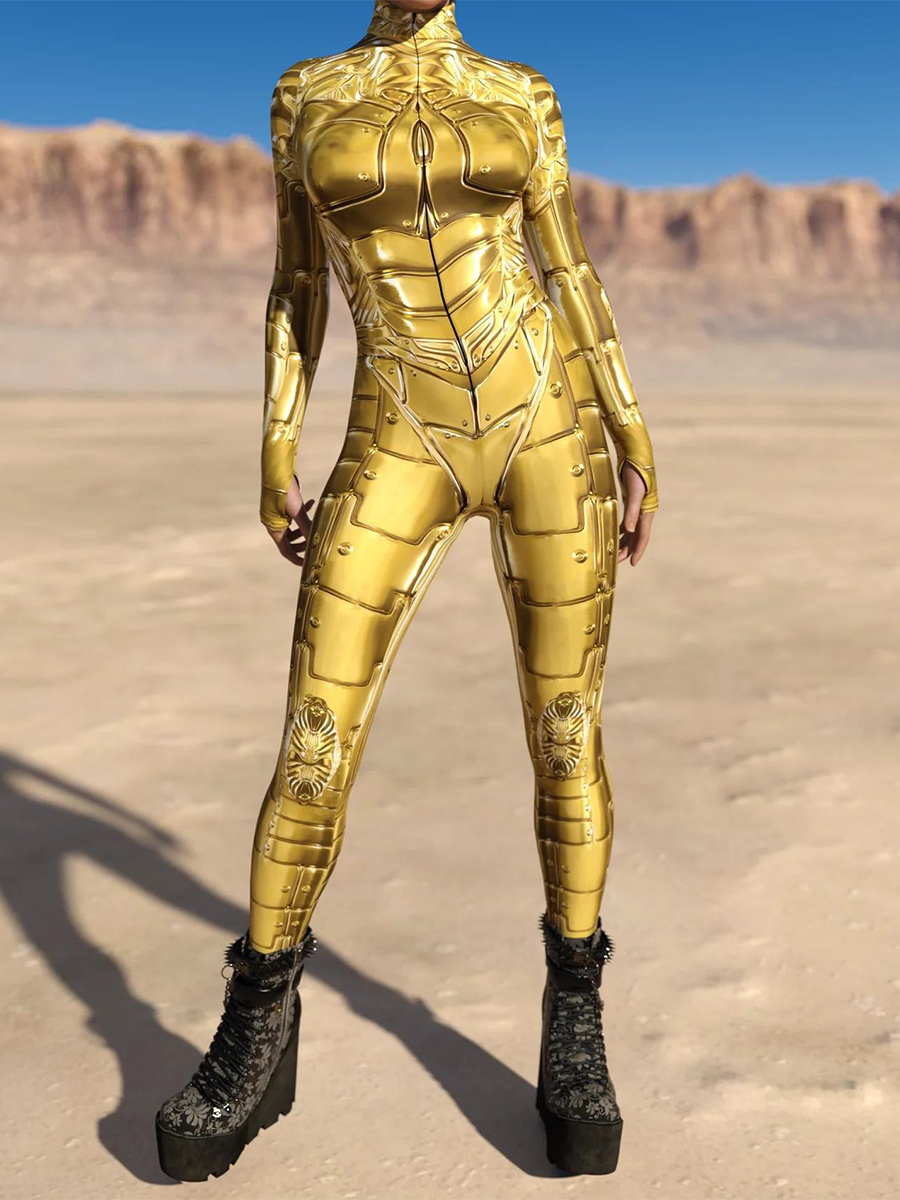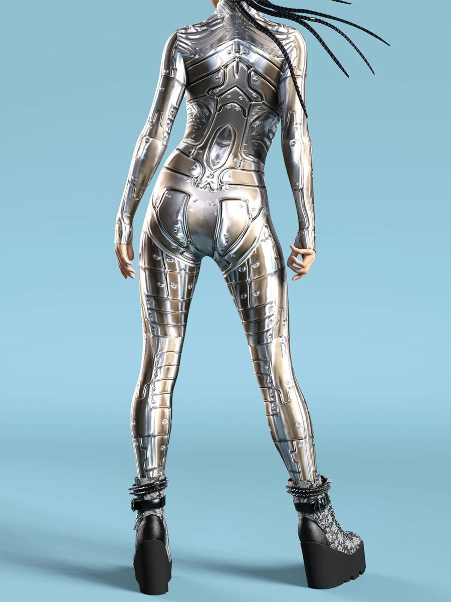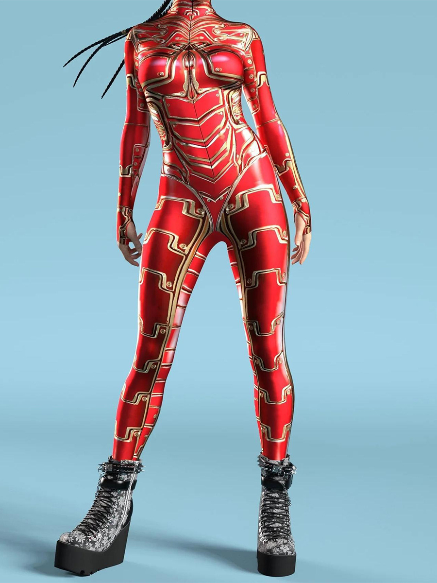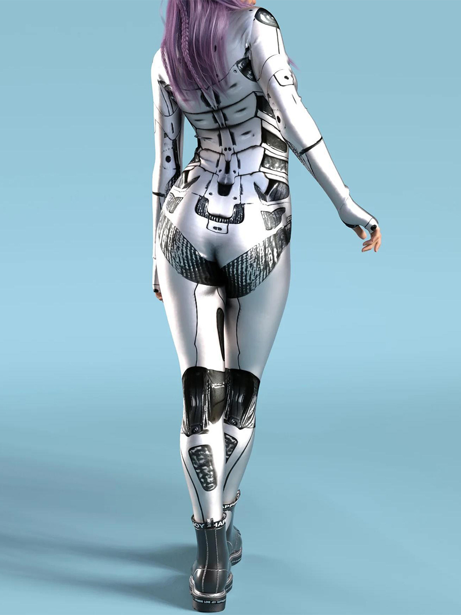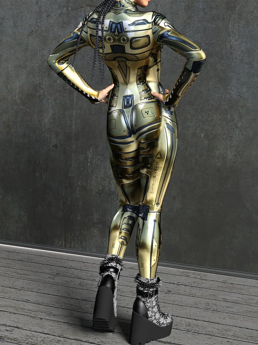 セクシーなレディースボディスーツ サイバーパンク 錯視ロボットプリント メタリック ゼンタイ コスチューム