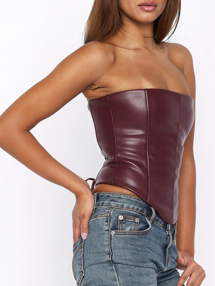 ヴィンテージフェイクレザーレースアップコルセットトップ ストラップレス スリムフィット ビスチェ レディース 2026