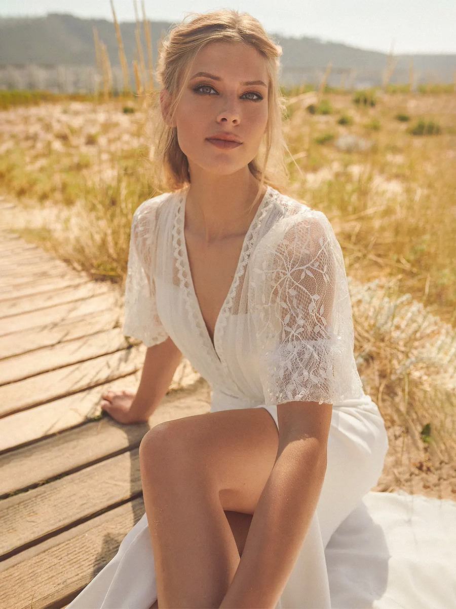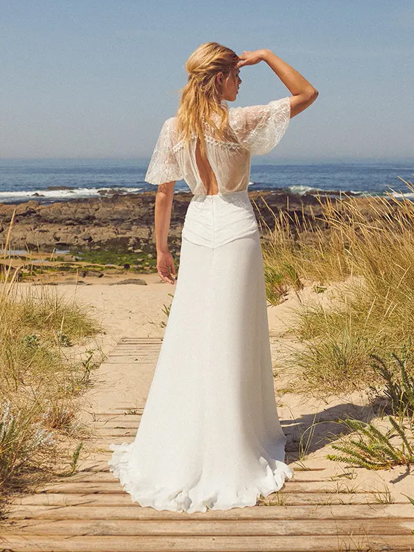 ボヘミアンウェディングドレス シフォン フロントスリット Aライン トレーン付き ナチュラルウエスト ウェディングドレス 機能的なボタン 半袖 Vネック アイボリー