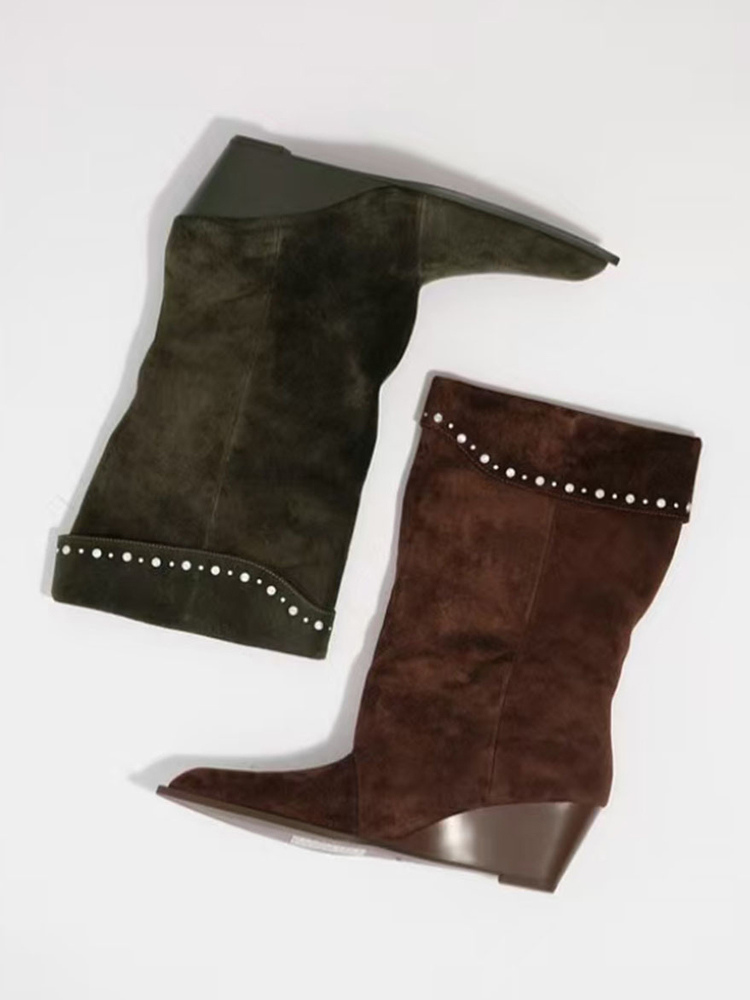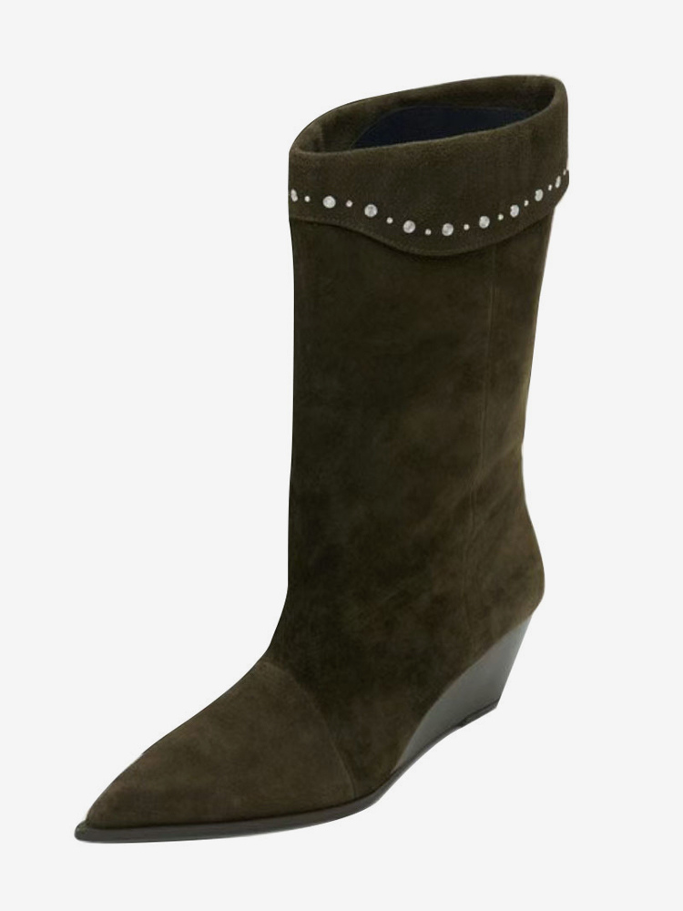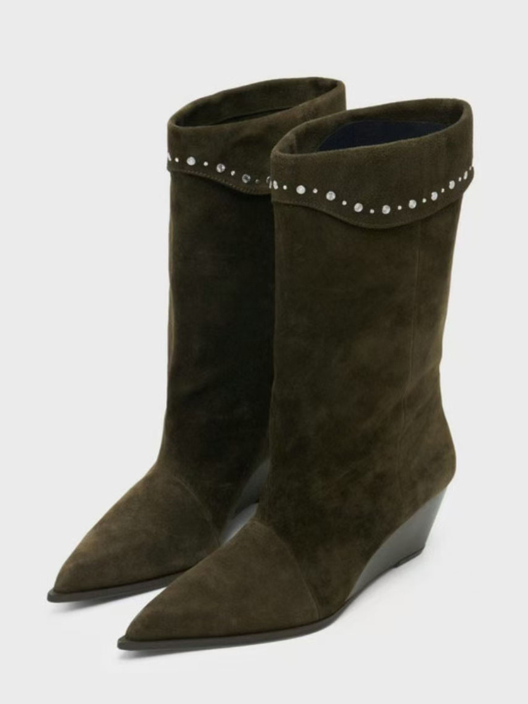 スエードミッドクラフブーツ レディース ポインテッドトゥ ラインストーン ウェッジヒール ブーティ