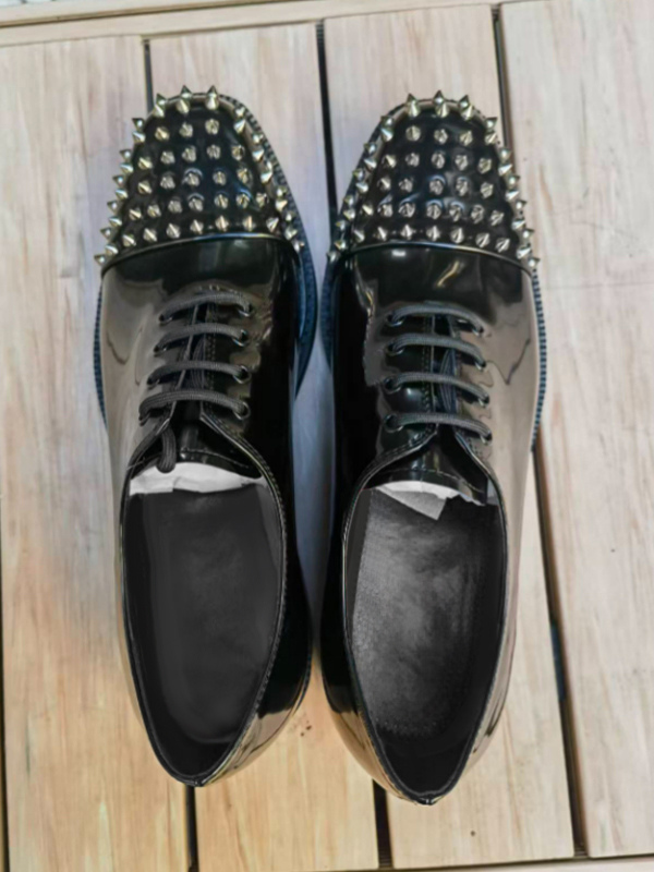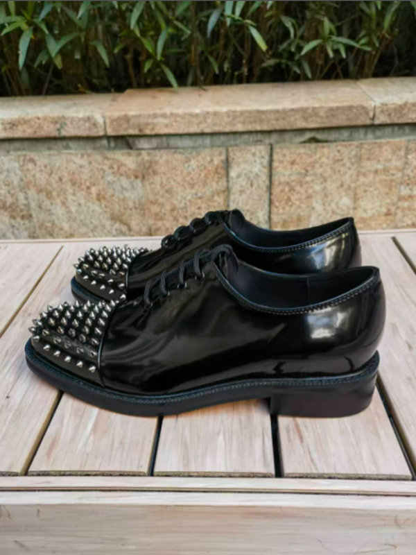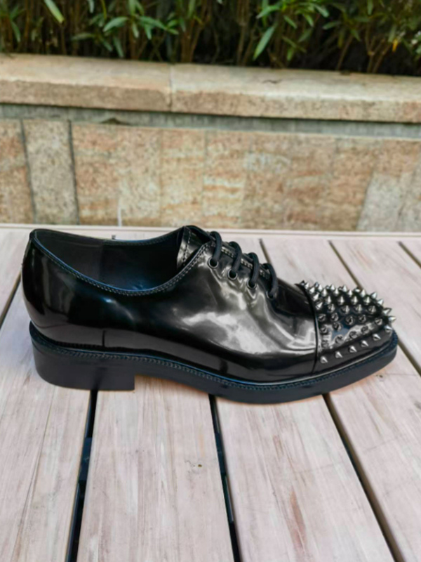 メンズ用ブラックドレスシューズ ラウンドトゥ スタッズ レースアップ プロムシューズ