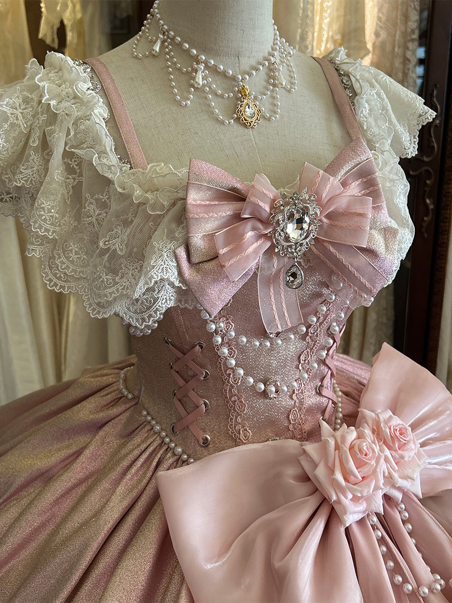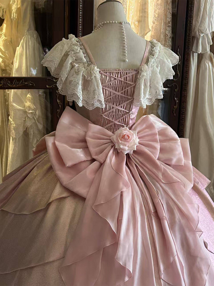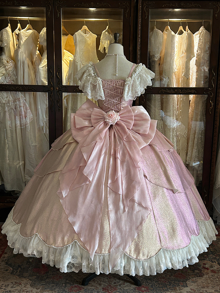 妖精のロリータドレス ピンクのボールガウン ビーズの花 バックリボン レースバンデージ レーススリーブ ロリータドレス