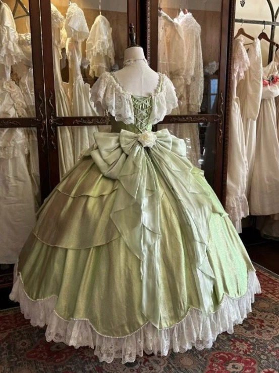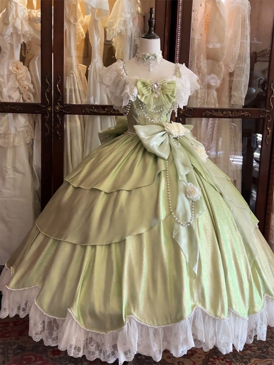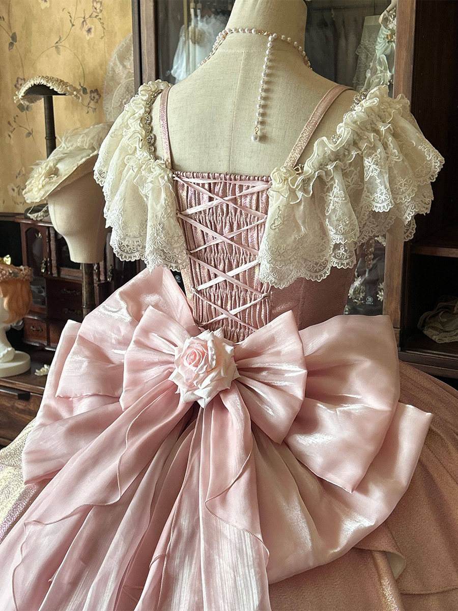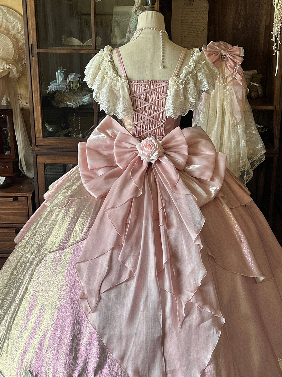 妖精のロリータドレス ピンクのボールガウン ビーズの花 バックリボン レースバンデージ レーススリーブ ロリータドレス