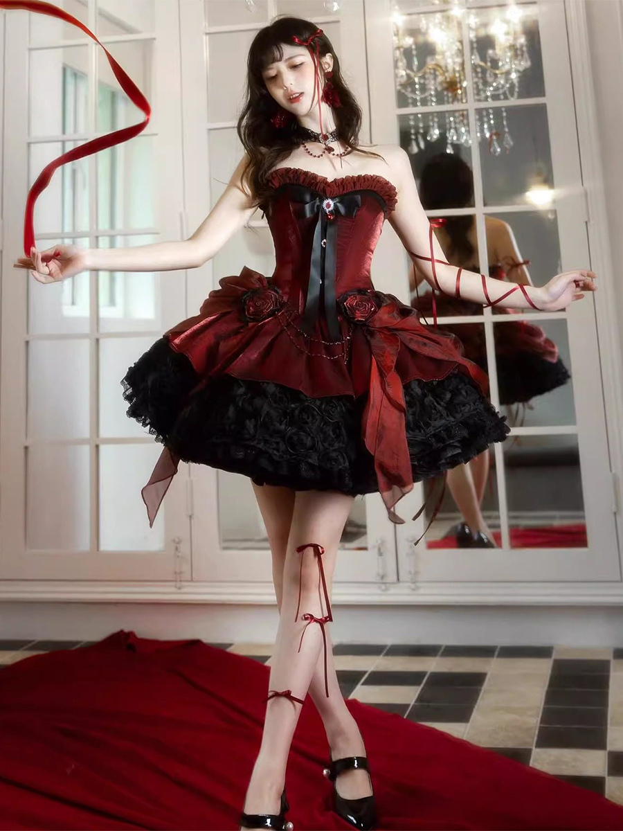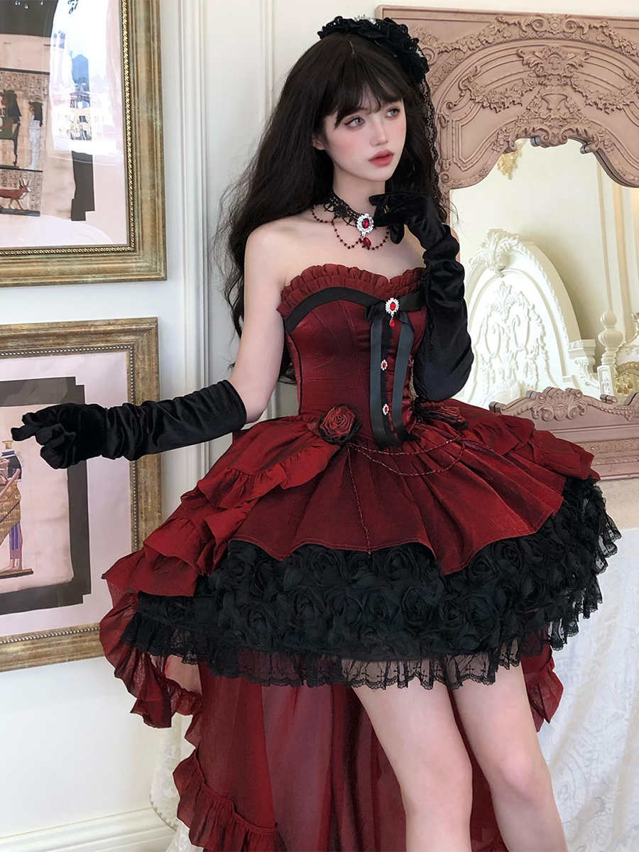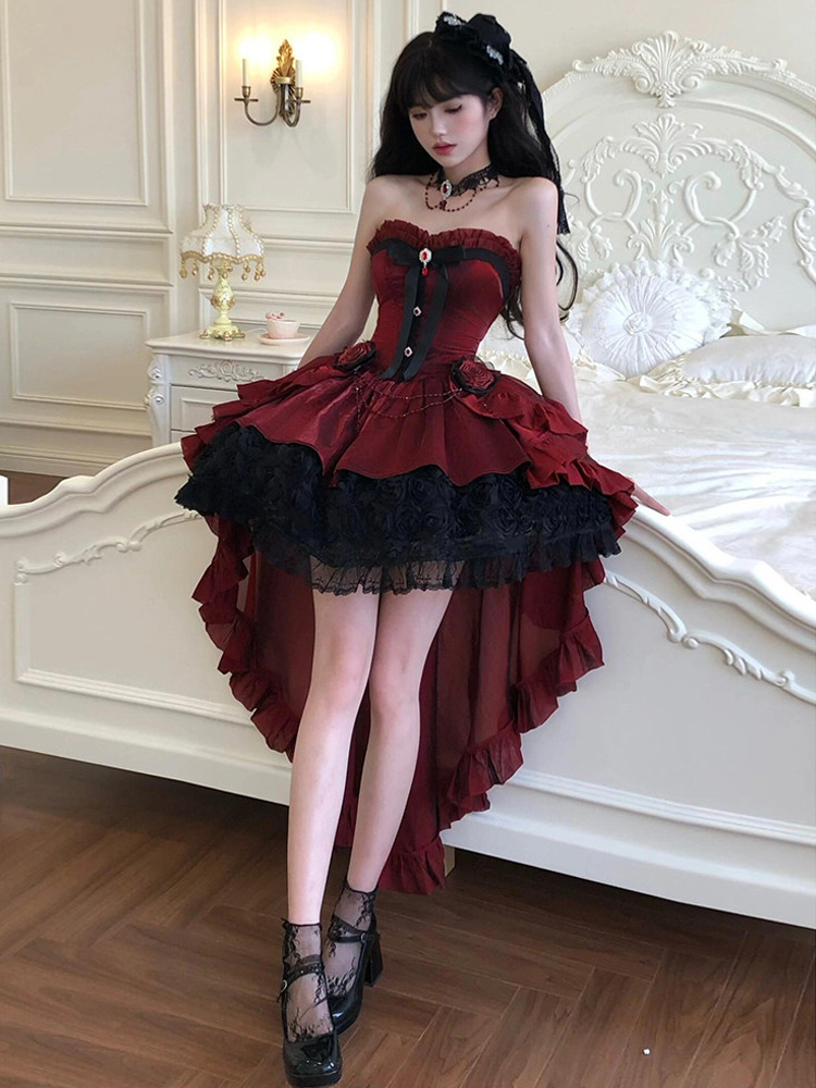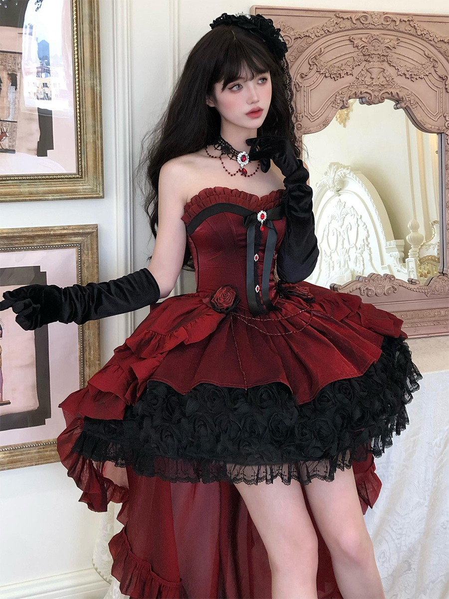 ゴシックロリータドレス 赤 黒 スイートハート ストラップレス フリル リボン ショートロリータドレス