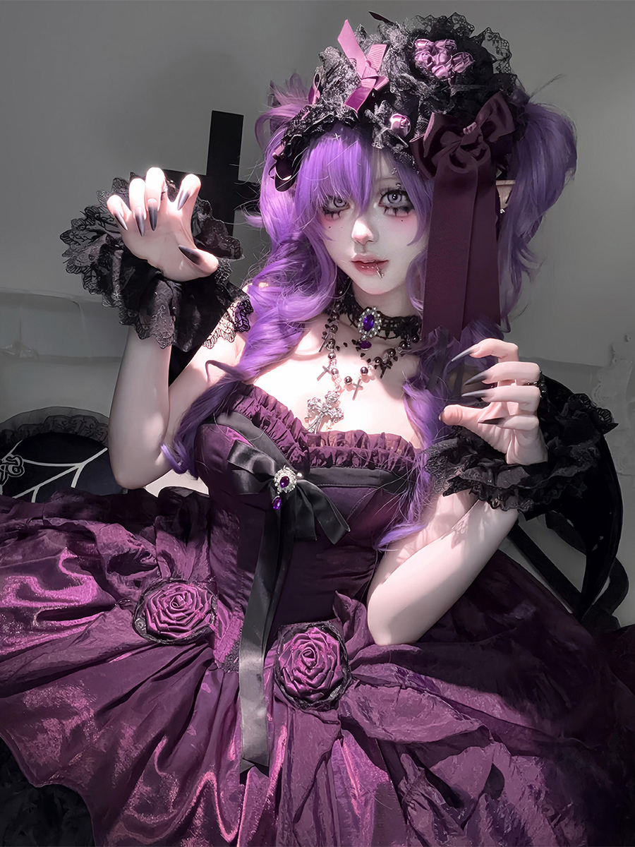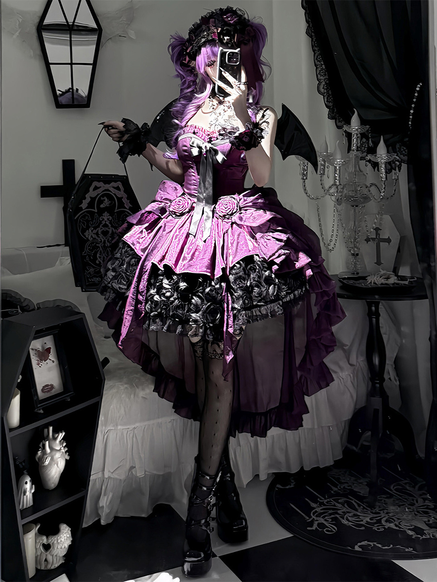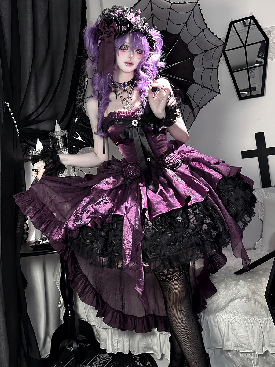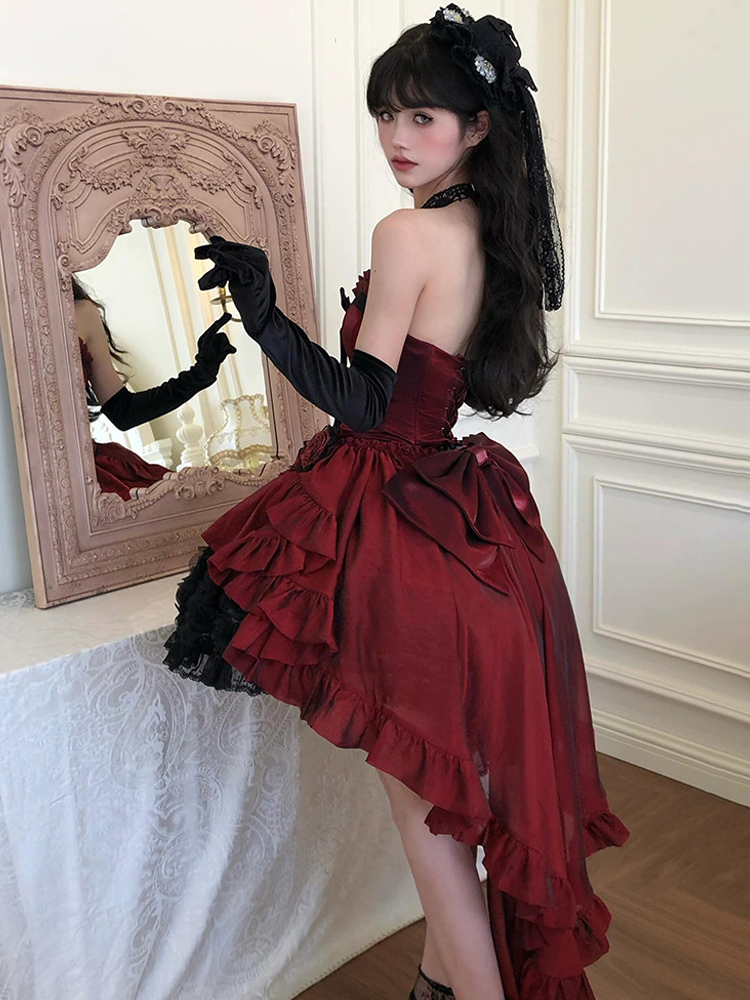 ゴシックロリータドレス 赤 黒 スイートハート ストラップレス フリル リボン ショートロリータドレス