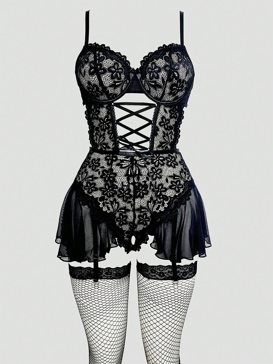 ランジェリー テディ レース バックレス ダークネイビー エメラルドグリーン フリルスカート ベビードール ガーターストラップ 網タイツ付き