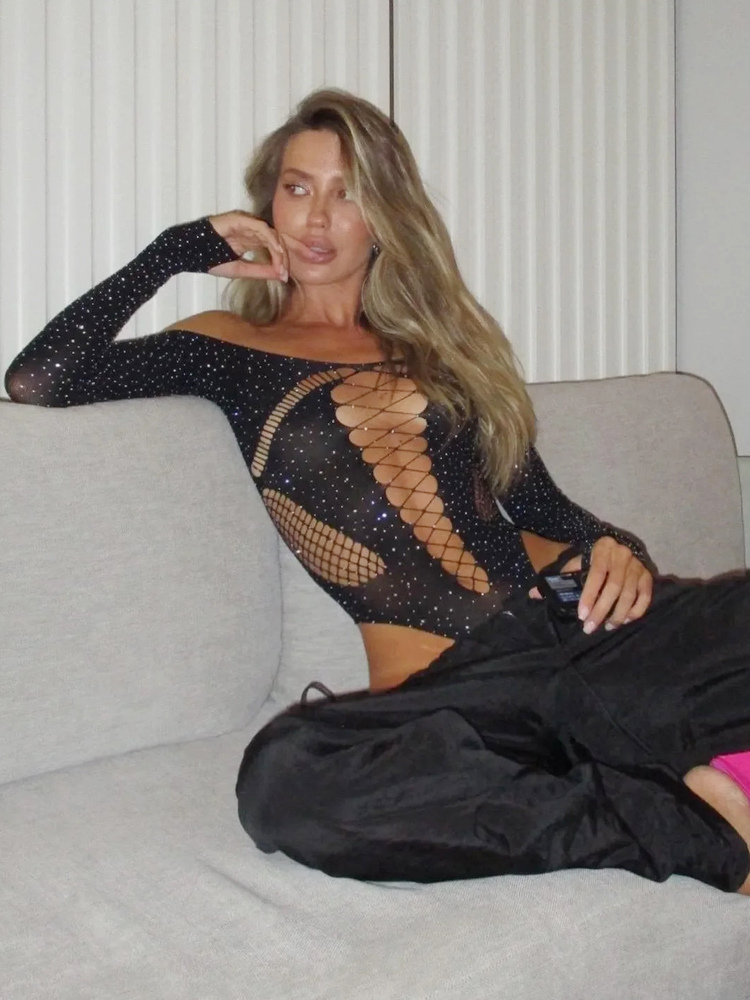テディ ラインストーン イエロー シアー レース コントラスト メッシュ トップ ロングスリーブ シースルー ボディスーツ