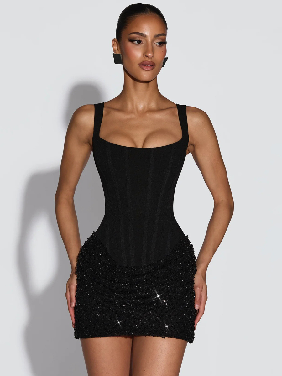 コルセット スパンコール ノースリーブ ボディコン ミニ パーティードレス レディース 2026
