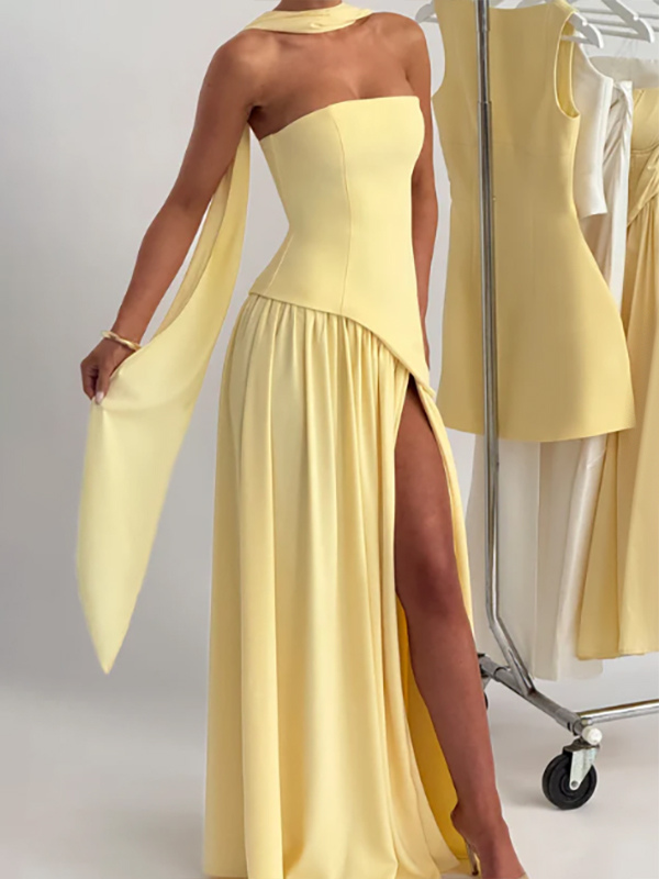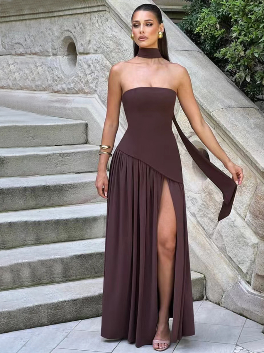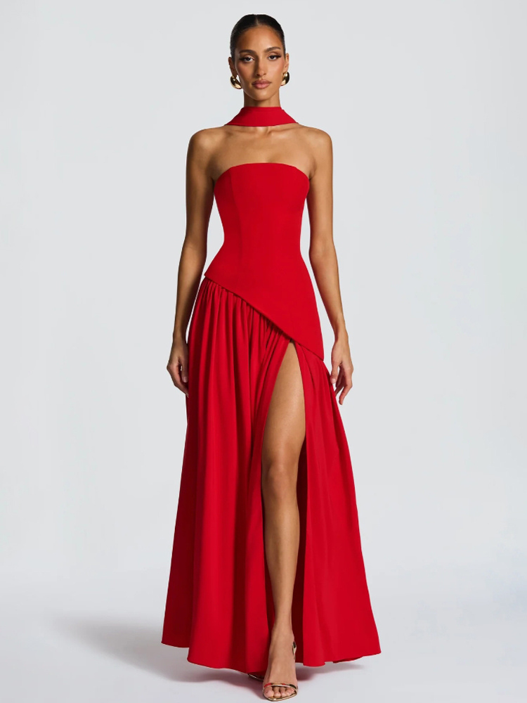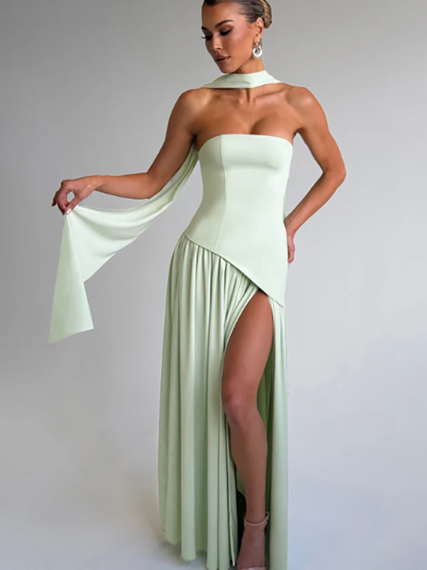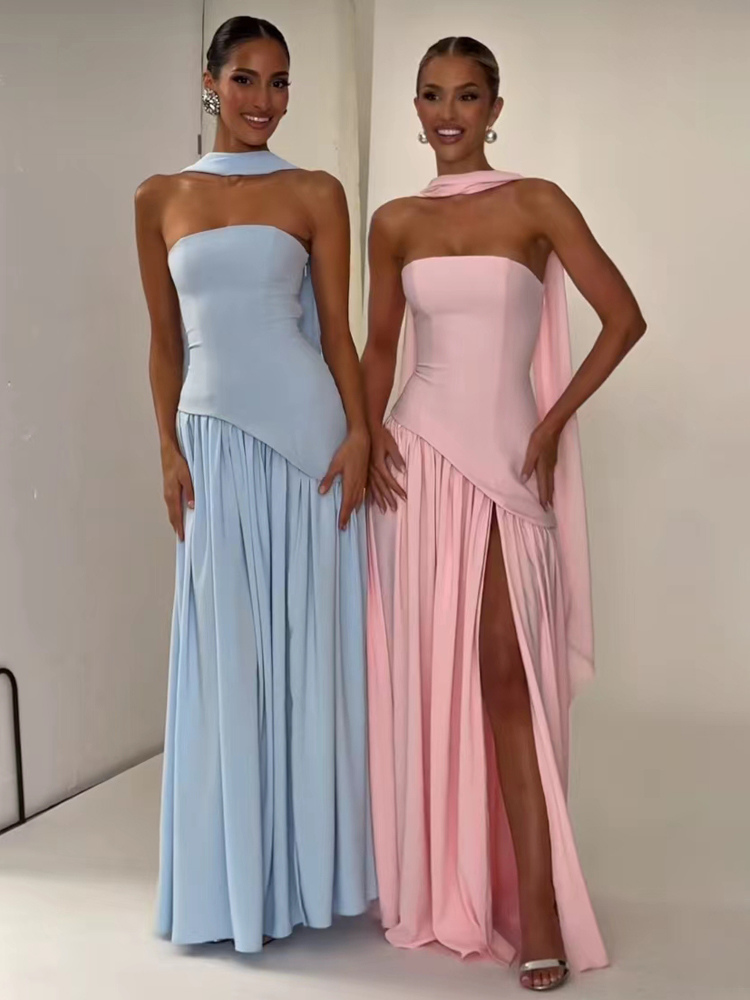 2026年レディース向けスカーフ付きアシンメトリーデザイン ストラップレス マキシ パーティードレス