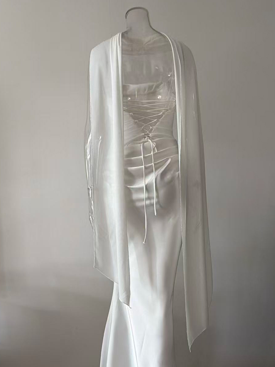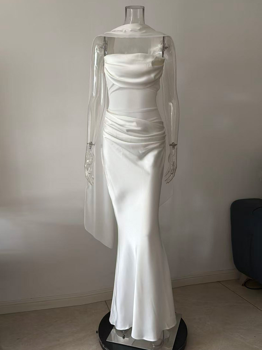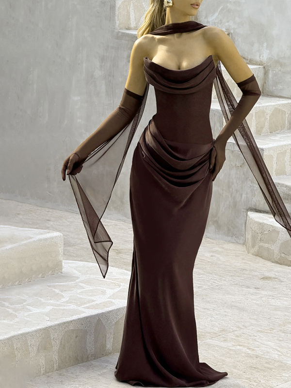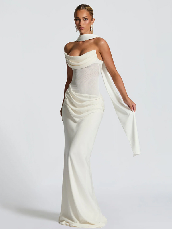 2026年レディース向け、スカーフ付き、ルーシュウエスト、スリムフィット、マーメイドマキシ丈プロムドレス