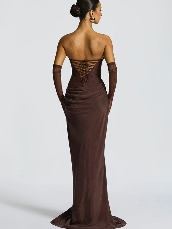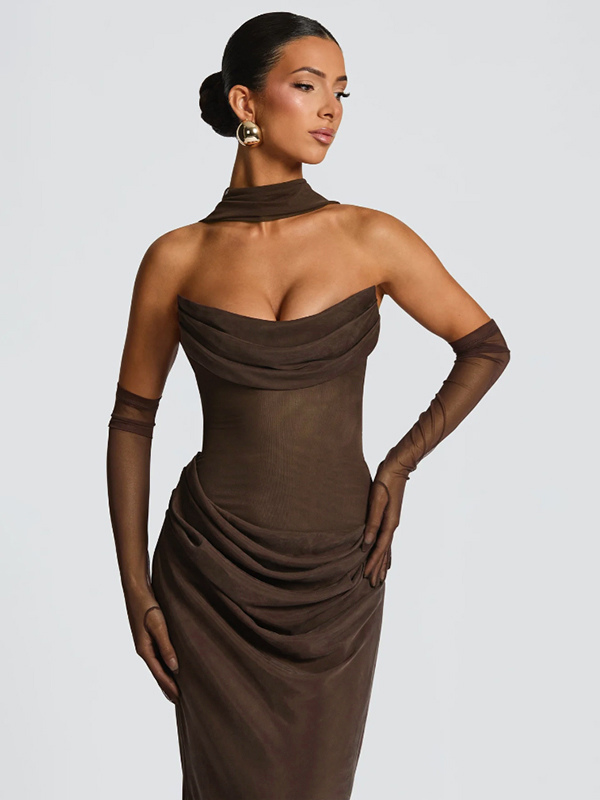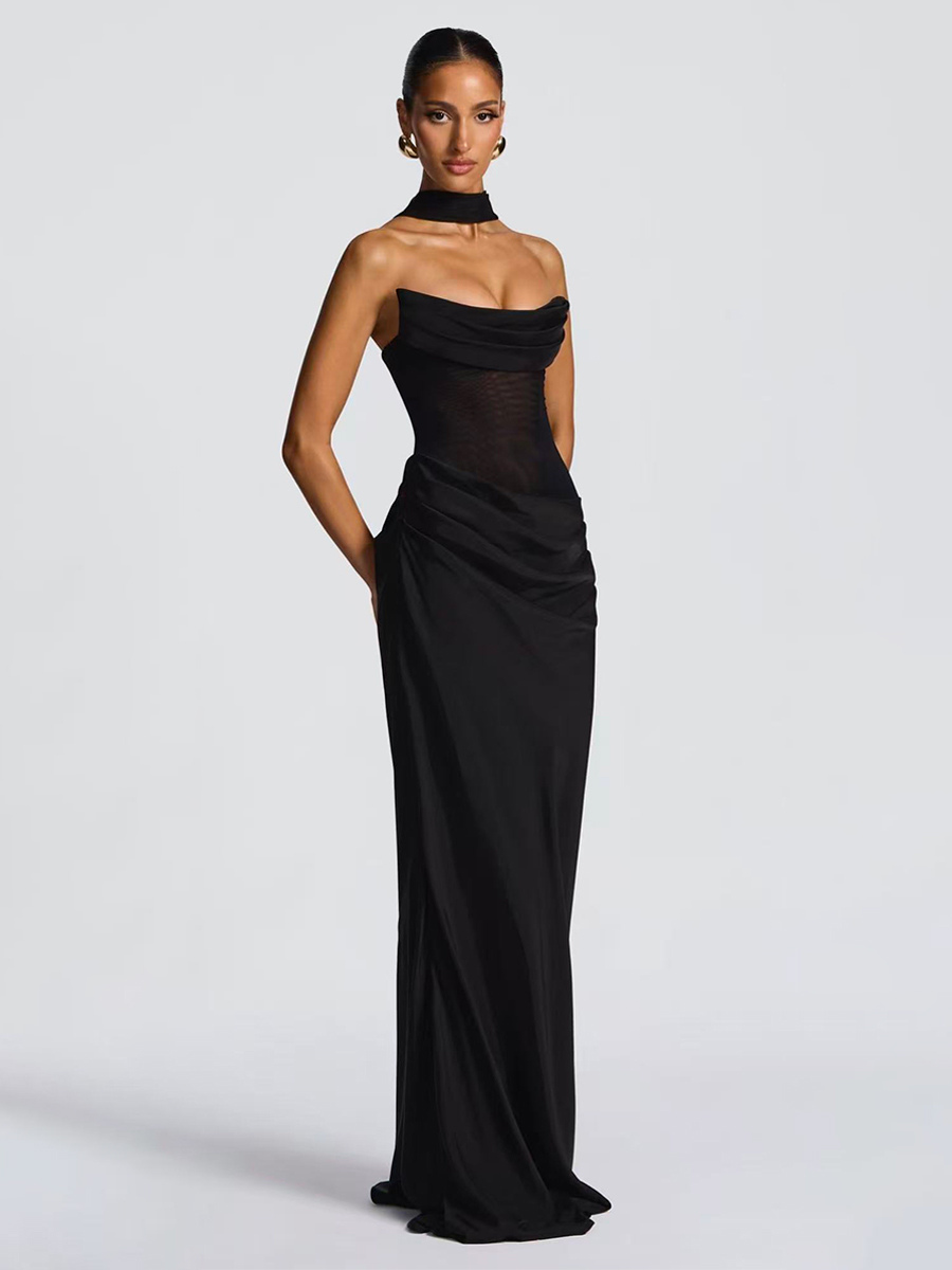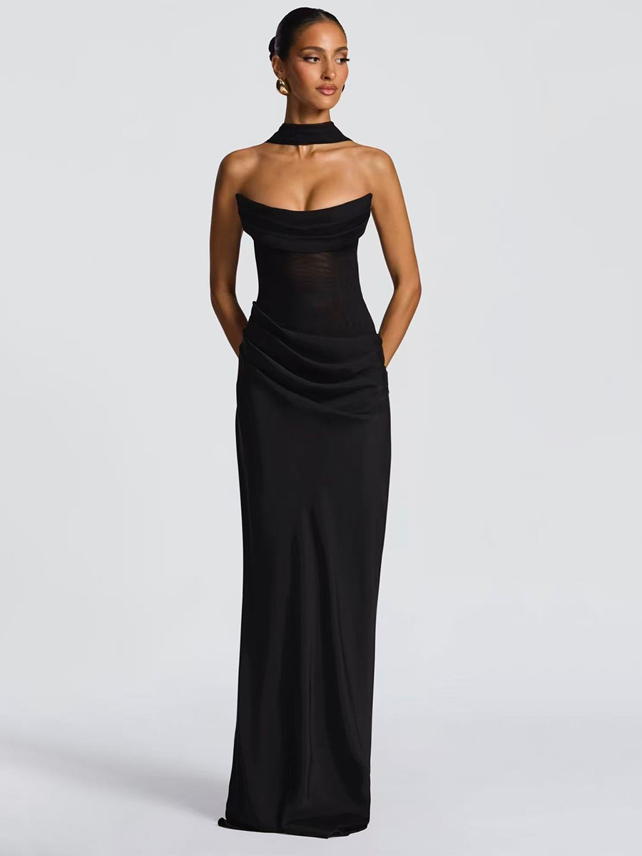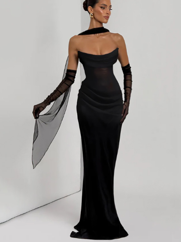 2026年レディース向け、スカーフ付き、ルーシュウエスト、スリムフィット、マーメイドマキシ丈プロムドレス