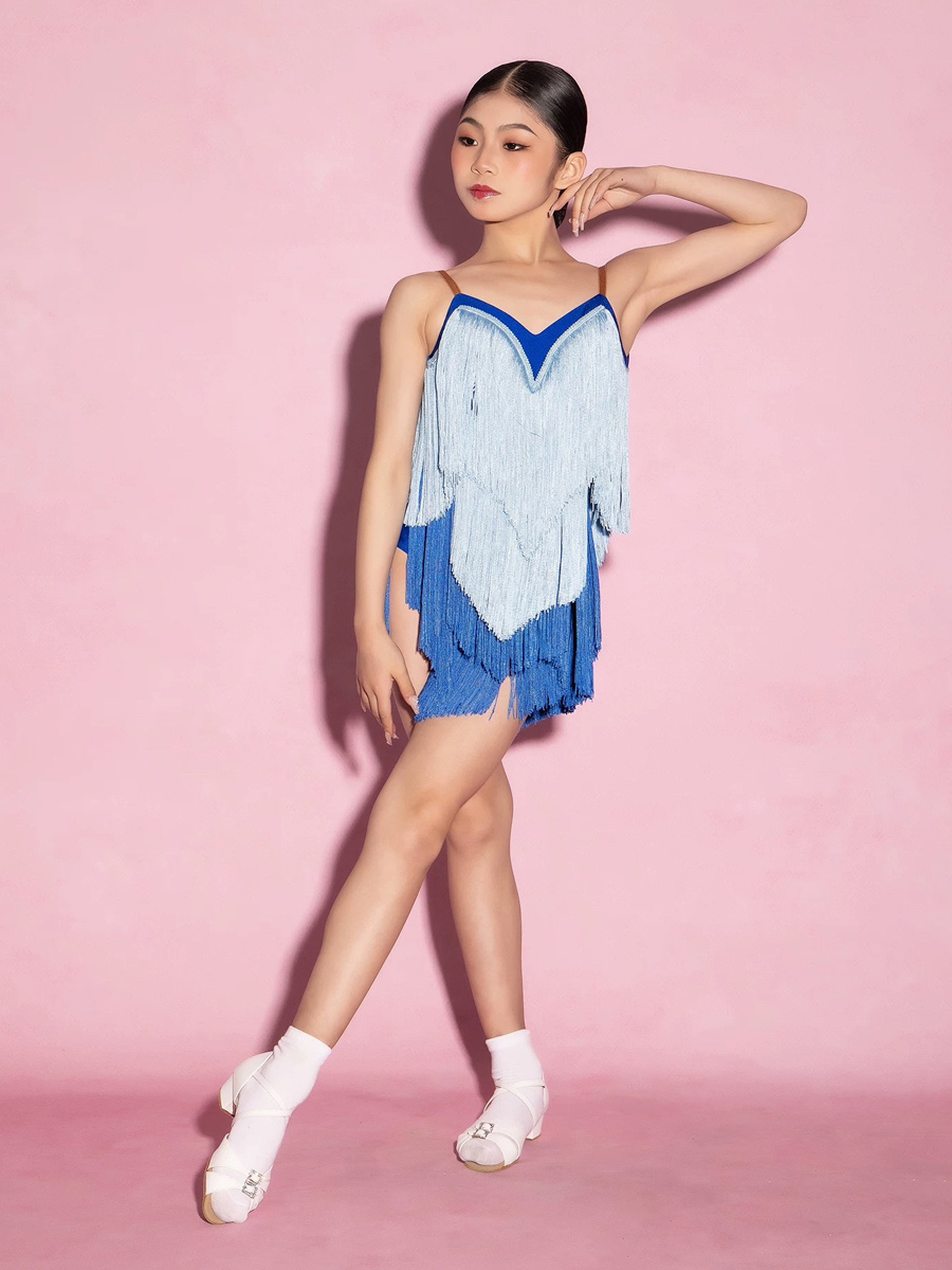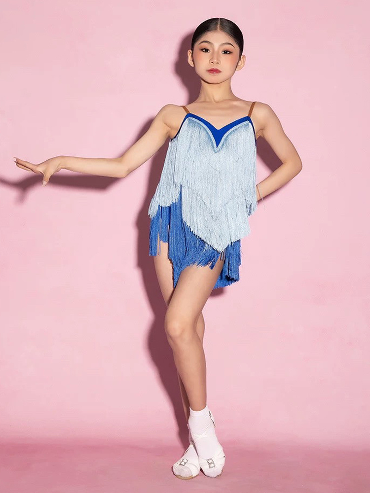 ラテンダンスドレス ブルー レディース フリンジ タッセル スパゲッティ ラテンダンサー コスチューム