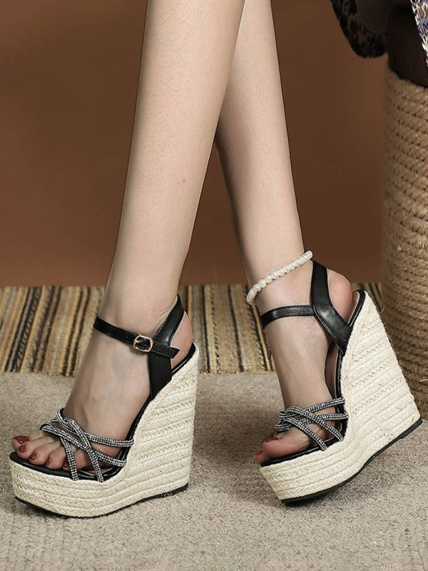レディース ウェッジサンダル プラットフォーム オープントゥ ラインストーン ウェッジ