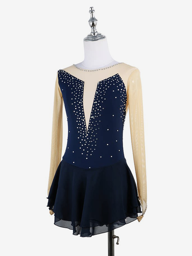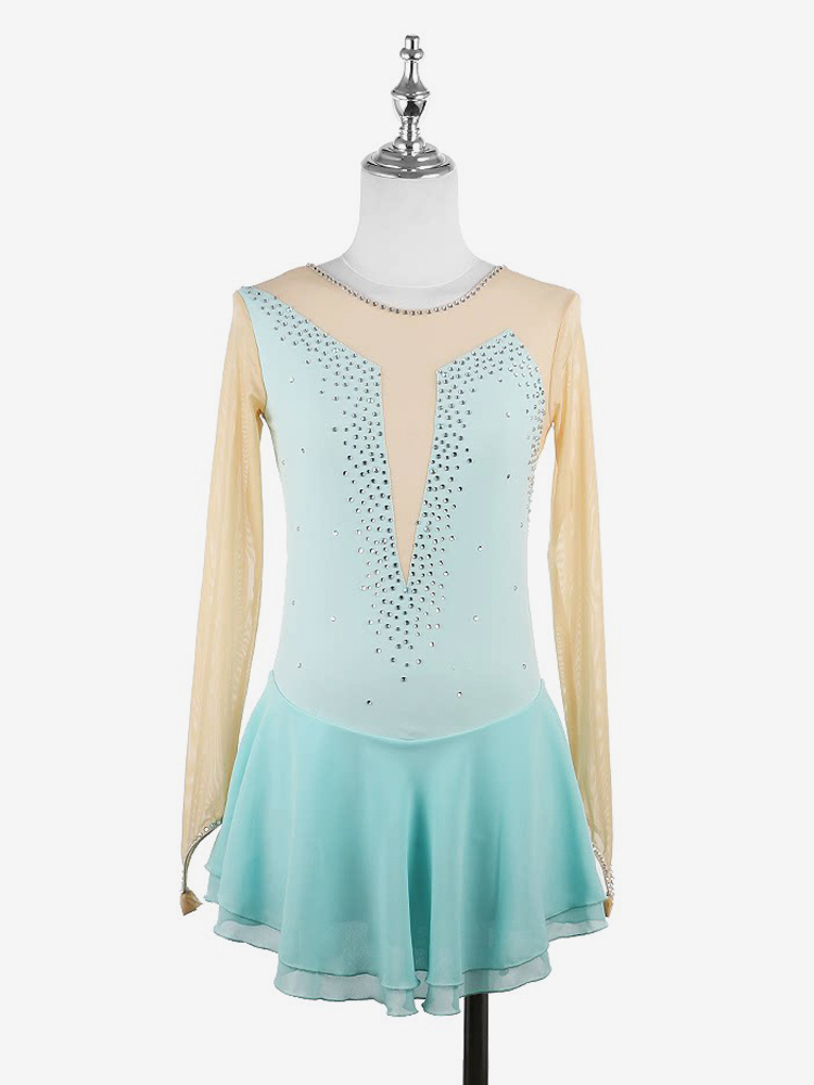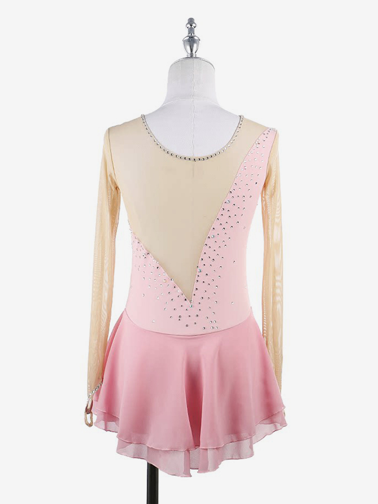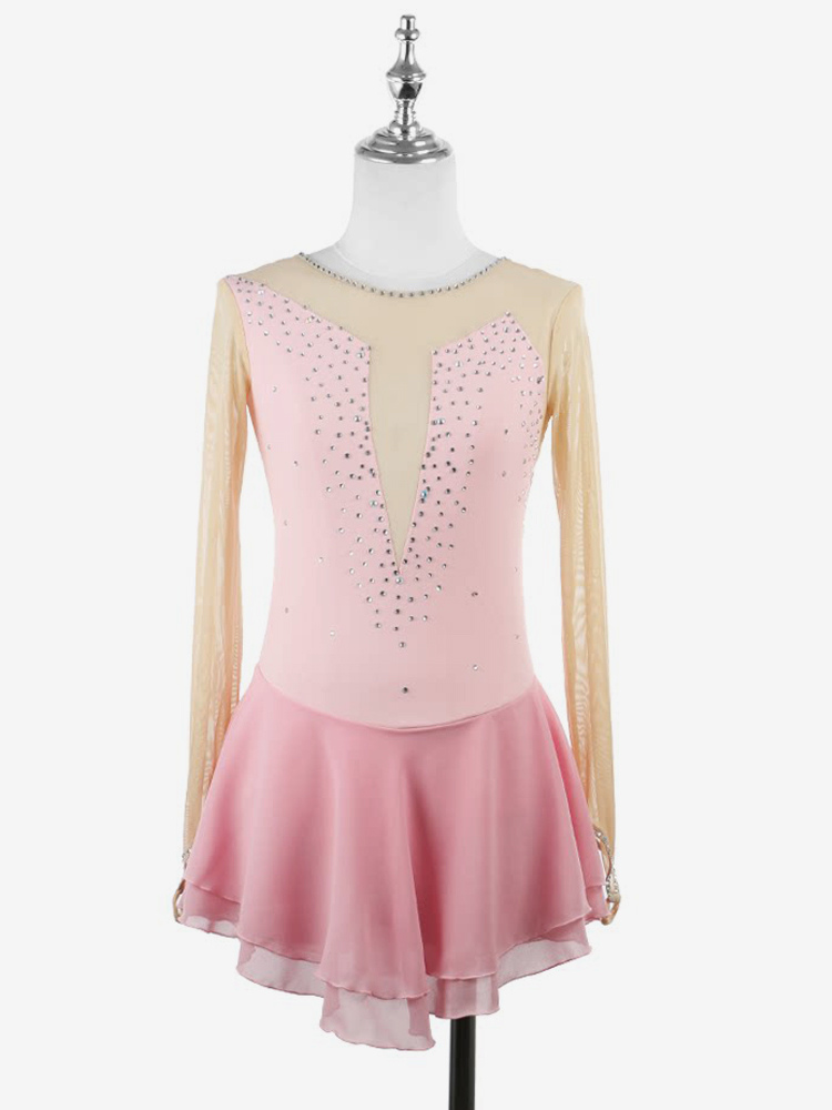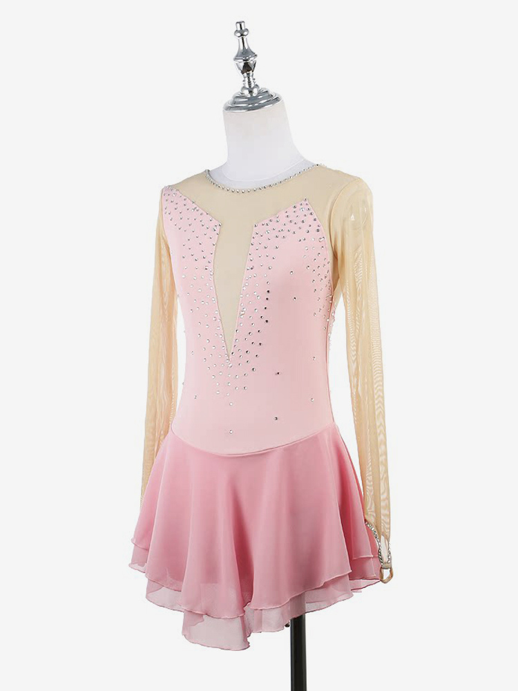 ピンクのスケートドレス ヌード 長袖 メッシュ ラインストーン 女性と女の子 アイススケータードレス