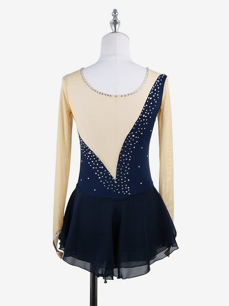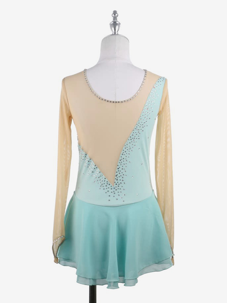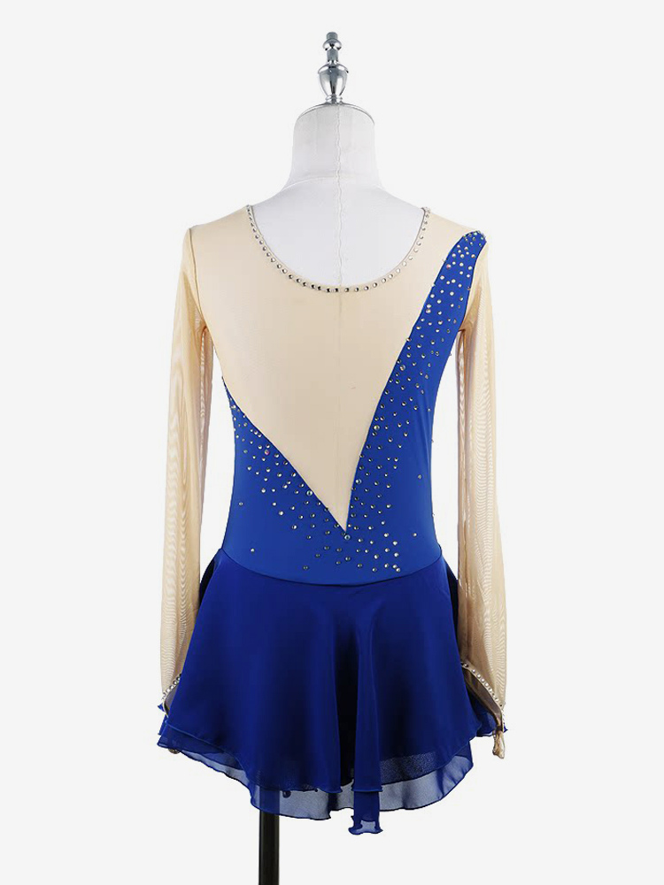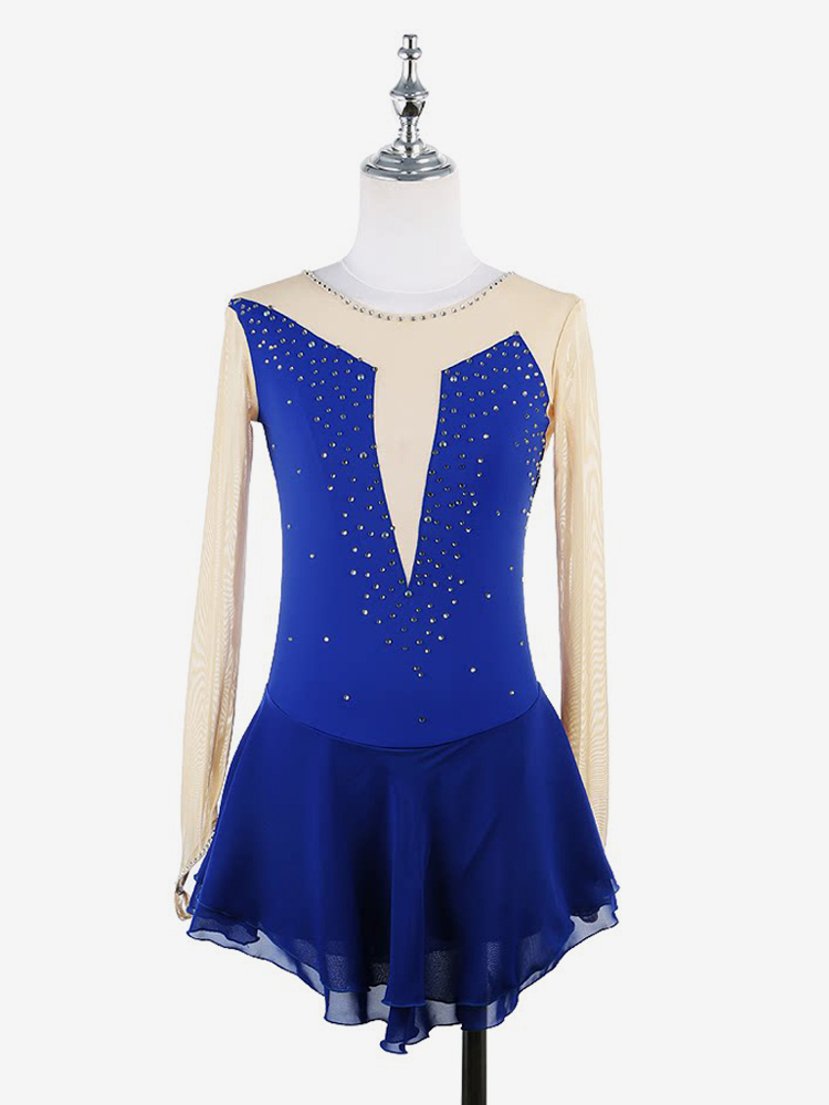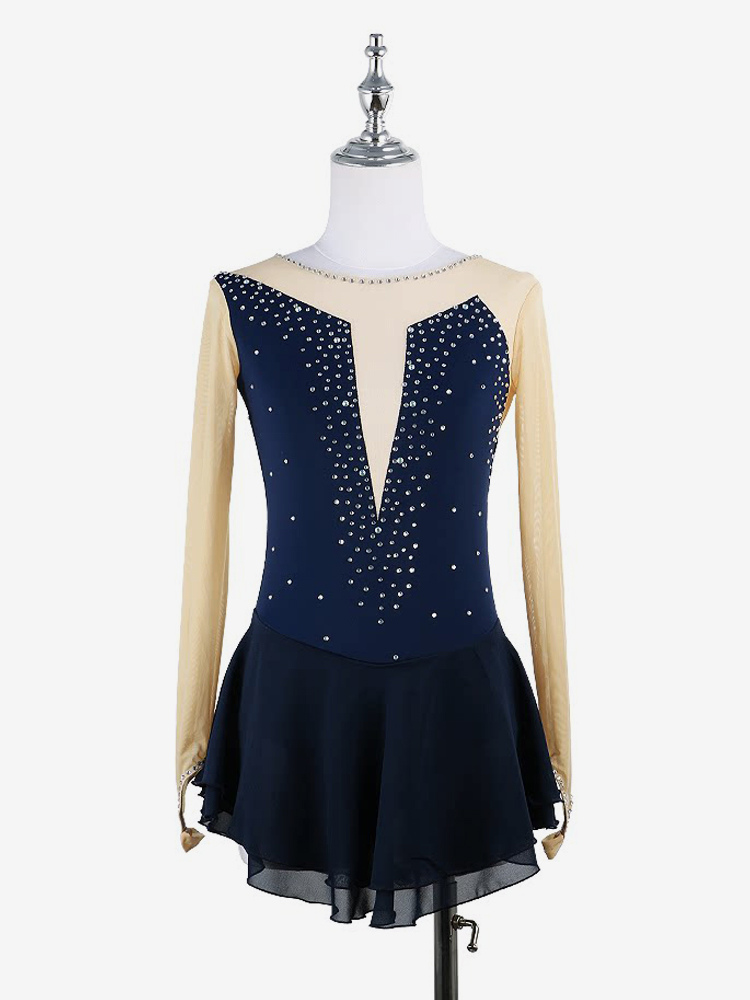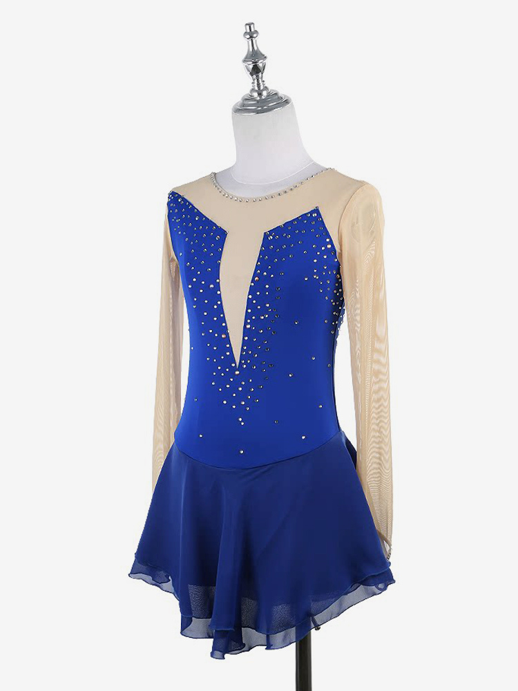 ピンクのスケートドレス ヌード 長袖 メッシュ ラインストーン 女性と女の子 アイススケータードレス