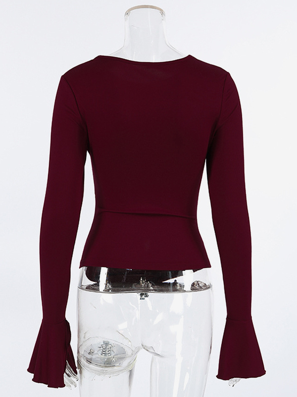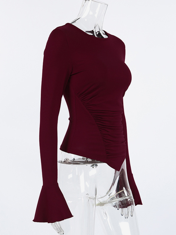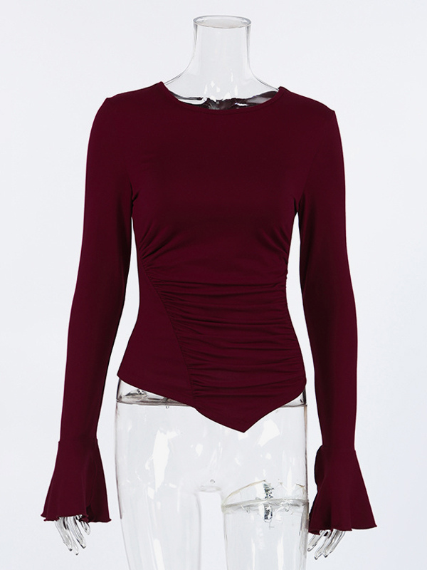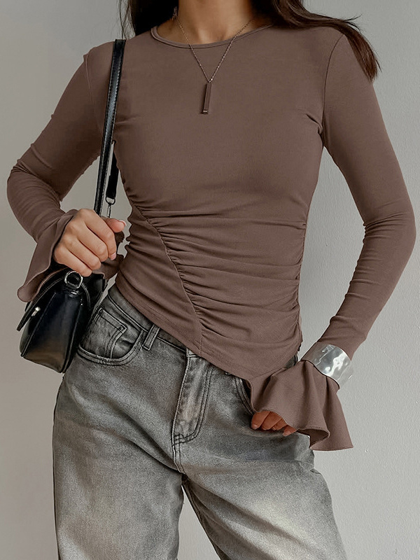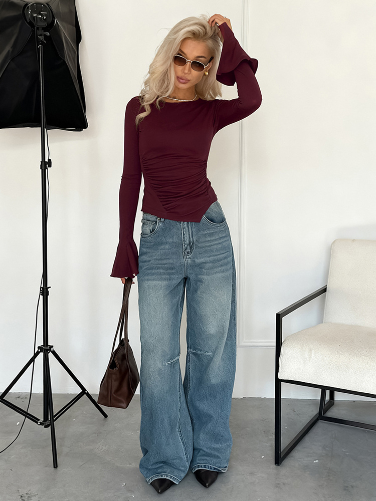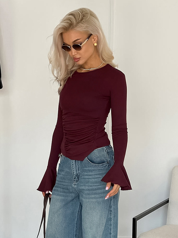 サイドギャザー入りレディース長袖トップス - シックなフレアベルカフスリムフィット - バディ風春ストリートウェア2026